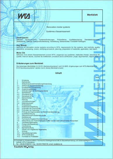 Das WTA-Merkblatt "Kalkputze in der Denkmalpflege" stellt die grundlegenden Voraussetzungen für die Anwendung von Kalkputzen bei der Restaurierung historischer Bauwerke dar. Es wendet sich an Architekten, Planer, Denkmalpfleger und Handwerker. Ziel des Merkbla...