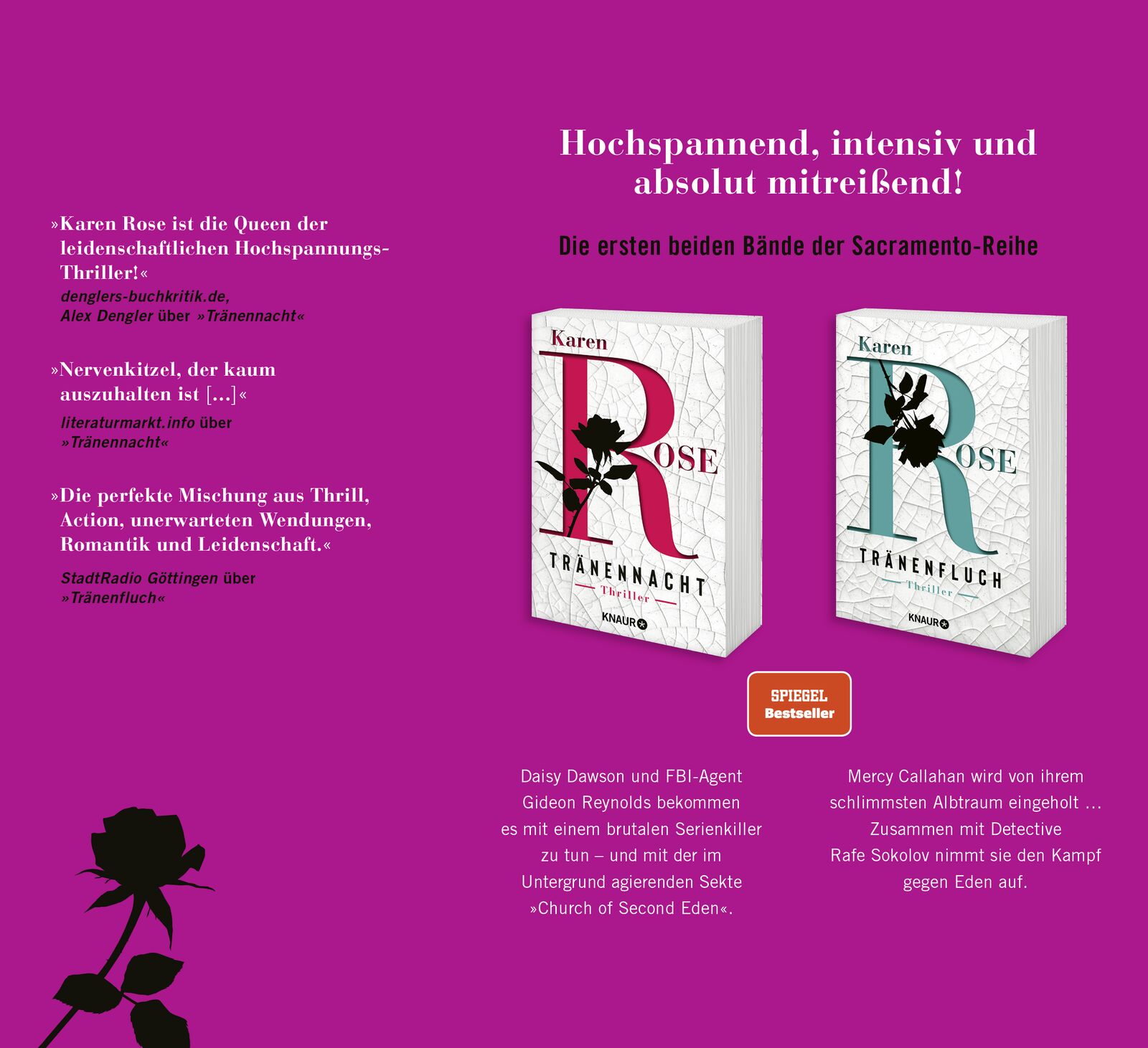 Wenn das Ende naht, ist die Gefahr am größten »Tränenschwur« ist der 3. Thriller der Sacramento-Reihe von Bestseller-Autorin Karen Rose und das atemraubende Finale der Geschichte um die mörderische Sekte Church of Second Eden. Zwar konnten die ehemaligen Sekt...