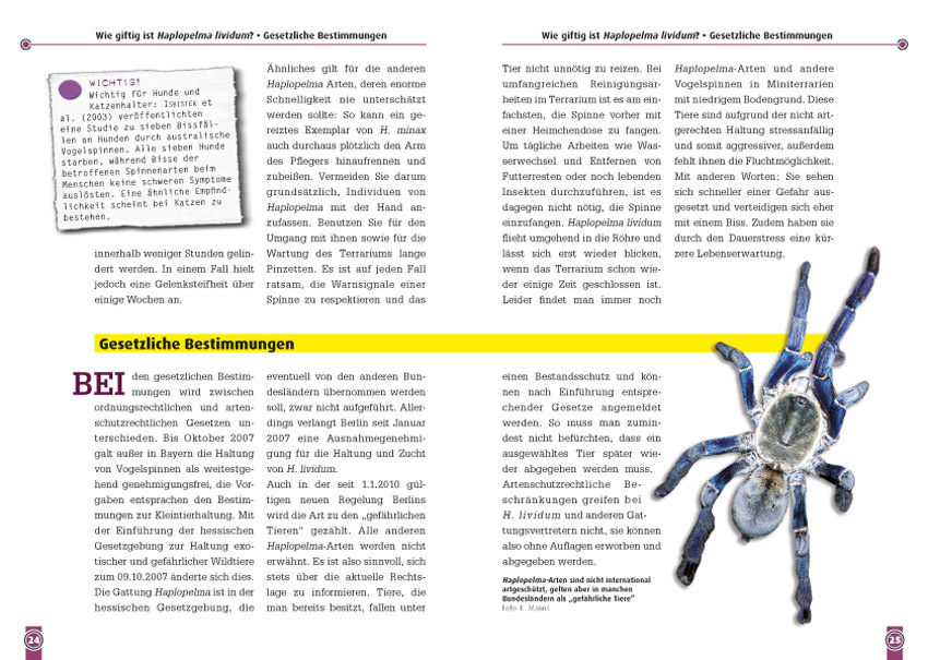 Die Pflege von Vogelspinnen ist in den vergangenen Jahren zu einem beliebten Hobby geworden. Haplopelma lividum (auch Blaue Burma-Vogelspinne oder Kobaltblaue Vogelspinne genannt) ist eine ausgesprochen flinke Art, die ihre neuweltlichen Verwandten geradezu ph...