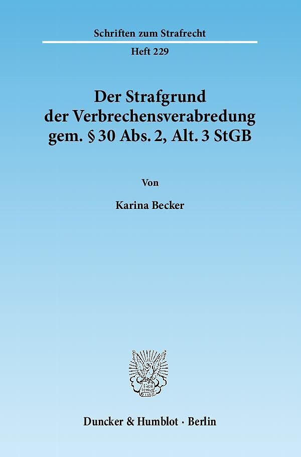 Die Verbrechensverabredung gem. § 30 Abs. 2, Alt. 3 StGB ist eine bedeutende Vorschrift, deren Legitimität und Interpretation bis heute umstritten sind. Die Autorin unterzieht die Strafbarkeit unter Einbeziehung der übrigen Begehungsvarianten des § 30 StGB ein...