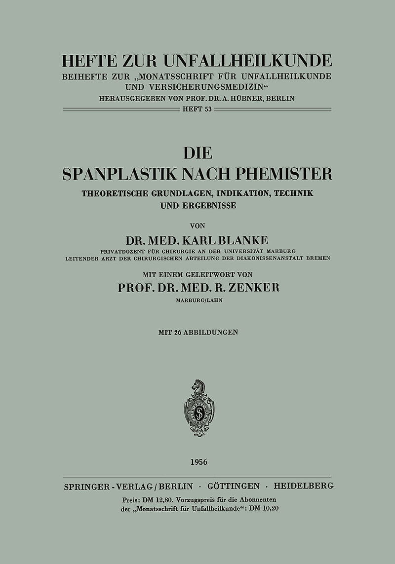 In der vorliegenden Arbeit stellt KARL BLANKE die theoretischen Grundlagen, die Indikation, die Technik und die Ergebnisse der Span plastik nach PHEMISTER dar. In einem theoretischen Teil wird zunachst der EinfluB der Osteo blastenlehre und der Metaplasielehre...