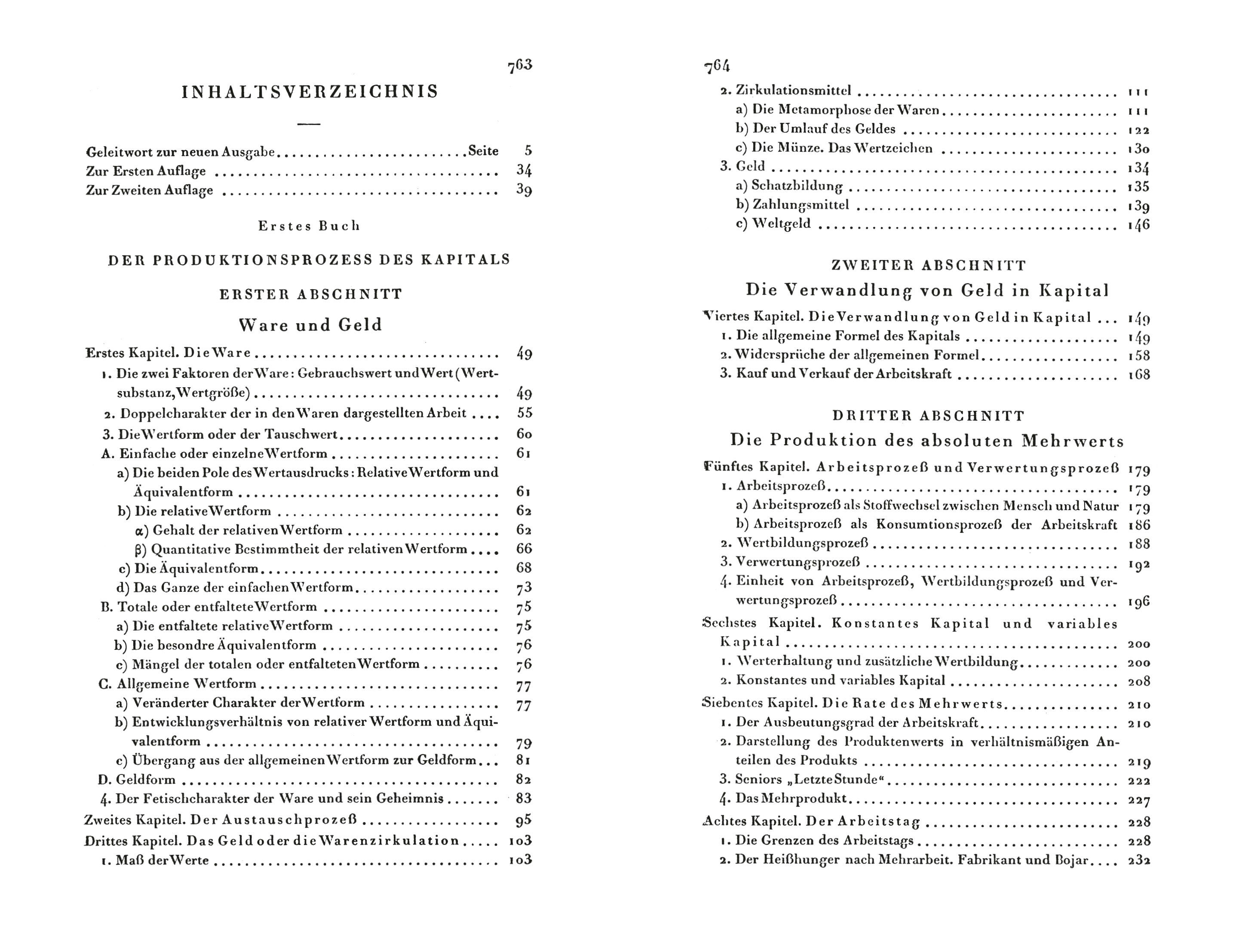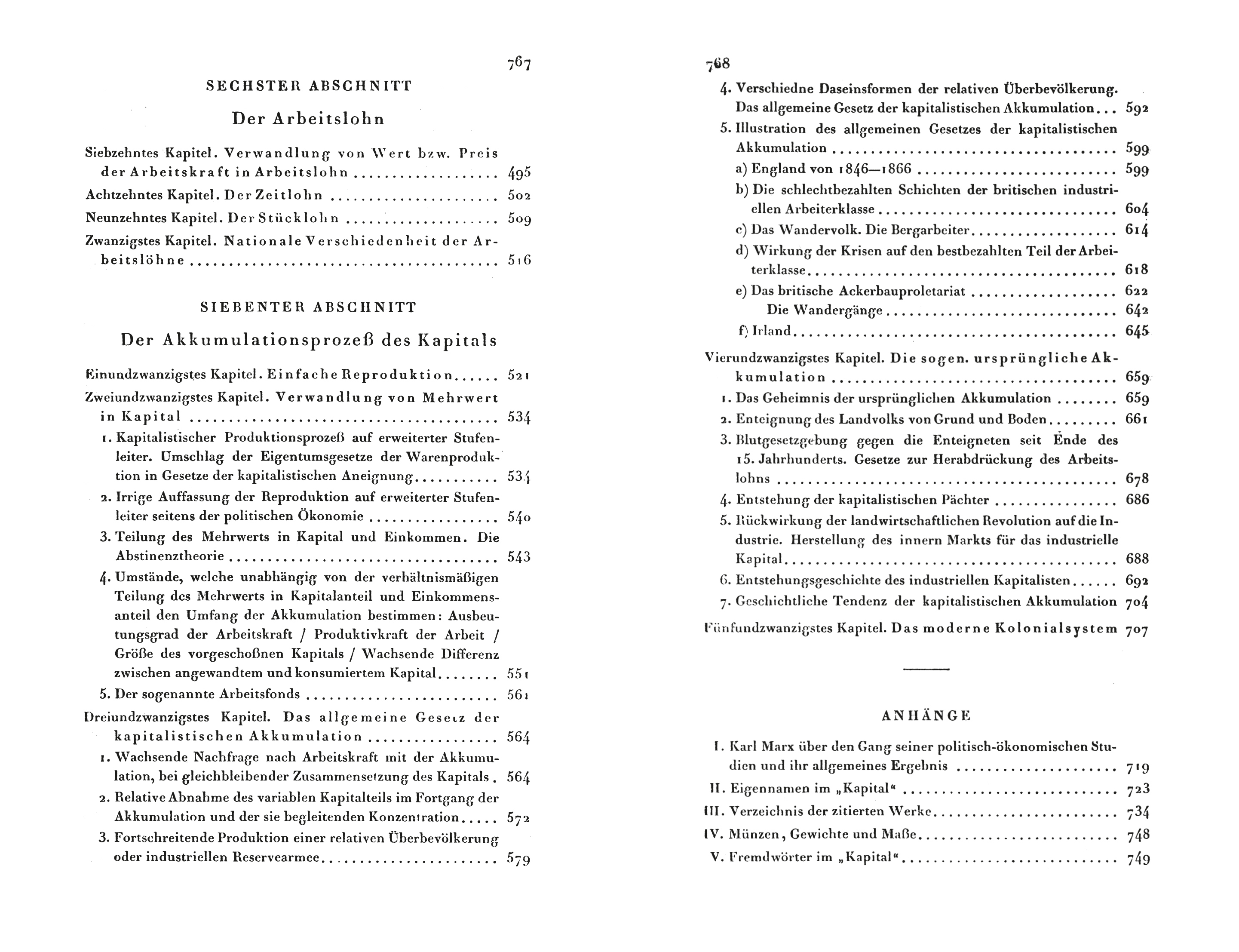 INHALTSVERZEICHNIS Geleitwort zur neuen Ausgabe, 5 Zur Ersten Auflage, 34 Zur Zweiten Auflage, 39 Erstes Buch DER PRODUKTIONSPROZESS DES KAPITALS ERSTER ABSCHNITT Ware und Geld Erstes Kapitel. Die Ware, 49 1.Die zwei Faktoren der Ware: Gebrauchswert und Wert (Wertsubstanz, Wertgröße), 49 2.Doppelcharakter der in den Waren dargestellten Arbeit, 55 3.Die Wertform oder der Tauschwert, 60 A. Einfache oder einzelne Wertform, 61 a)Die beiden Pole desWertausdrucks: Relative Wertform und Äquivalentform, 61 b)Die relative Wertform, 62 ) Gehalt der relativen Wertform, 62 ) Quantitative Bestimmtheit der relativen Wertform, 66 c)Die Äquivalentform, 68 d)Das Ganze der einfachen Wertform, 73 B. Totale oder entfaltete Wertform, 75 a)Die entfaltete relative Wertform, 75 b)Die besondre Äquivalentform, 76 c)Mängel der totalen oder entfalteten Wertform, 76 C. Allgemeine Wertform, 77 a)Veränderter Charakter derWertform77 b)Entwicklungsverhältnis von relativer Wertform und Äquivalentform, 79 c)Übergang aus der allgemeinen Wertform zur Geldform, 81 D. Geldform, 82 4.Der Fetischcharakter der Ware und sein Geheimnis, 83 Zweites Kapitel. Der Austauschprozeß, 95 Drittes Kapitel. Das Geld oder die Warenzirkulation, 103 1. Maß der Werte, 103 2 Zirkulationsmittel, 111 a)Die Metamorphose der Waren, 111 b)Der Umlauf des Geldes, 122 c)Die Münze. Das Wertzeichen, 1 30 3. Geld, 134 a)Schatzbildung, 135 b)Zahlungsmittel, 139 c)Weltgeld, 146 ZWEITER ABSCHNITT Die Verwandlung von Geld in Kapital Viertes Kapitel. Die Verwandlung von Geld in Kapital, 149 1.Die allgemeine Formel des Kapitals, 149 2.Widersprüche der allgemeinen Formel, 158 3.Kauf und Verkauf der Arbeitskraft, 168 DRITTER ABSCHNITT Die Produktion des absoluten Mehrwerts Fünftes Kapitel. Arbeitsprozeß und Verwertungsprozeß, 179 1.Arbeitsprozeß, 179 a)Arbeitsprozeß als Stoffwechsel zwischen Mensch und Natur, 179 b)Arbeitsprozeß als Konsumtionsprozeß derArbeitskraft, 186 2.Wertbildungsprozeß, 188 3.Verwertungsprozeß, 192 4.Einheit von Arbeitsprozeß, Wertbildungsprozeß und Verwertungsprozeß, 196 Sechstes Kapitel. Konstantes Kapital und variables Kapital, 200 1.Werterhaltung und zusätzliche Werbildung, 200 2.Konstantes und variables capital, 208 Siebentes Kapitel. Die Rate des Mehrwerts, 210 1.Der Ausbeutungsgrad der Arbeitskraft, 210 2.Darstellung des Produktenwerts in verhältnismäßigen Anteilen des Produkts, 219 3.Seniors Letzte Stunde, 222 4.Das Mehrprodukt, 227 Achtes Kapitel. Der Arbeitstag, 228 1.Die Grenzen des Arbeitstags, 228 2.Der Heißhunger nach Mehrarbeit. Fabrikant und Bojar, 232 3.Englische lndustriezweige ohne gesetzliche Schranke der Ausbeutung, 239 4.Tag- und Nachtarbeit. Das Ablösungssystem, 251 5.Der Kampf um den Normalarbeitstag. Zwangsgesetze zur Verlängerung des Arbeitstags von der Mitte des 14. bis zu Ende des 17. Jahrhunderts, 258 6.Der Kampf um den Normalarbeitstag. Zwangsgesetzliche Beschränkung der Arbeitszeit. Die englische Fabrikgesetzgebung von 1833-64, 269 7.Der Kampf um den Normalarbeitstag. Rückwirkung der englischen Fabrikgesetzgebung auf andre Länder.288 Neuntes Kapitel. Rate und Masse des Mehrwerts, 292 VIERTER ABSCHNITT Die Produktion des relativen Mehrwerts Zehntes Kapitel. Begriff des relativen Mehrwerts, 301 Elftes Kapitel. Kooperation, 309 Zwölftes Kapitel. Teilung der Arbeit und Manufaktur, 323 1.Doppelter Ursprung der Manufaktur, 323 2.Der Teilarbeiter und sein Werkzeug, 325 3.Die beiden Grundformen der Manufaktur -mechanisch zusammenfügende Manufaktur und ·organisch verbindende Manufaktur, 328 4.Teilung der Arbeit innerhalb der Manufaktur und Teilung der Arbeit innerhalb der Gesellschaft, 337 5.Der kapitalistische Charakter der Manufaktur, 345 Dreizehntes Kapitel. Maschinerie und große Industrie, 354 1.Entwicklung der Maschinerie, 354 2.Wertabgabe der Maschinerie an das Produkt, 369 3.Nächste Wirkungen des maschinenmäßigen Betriebs auf den Arbeiter, 376 a)Aneignung zuschüssiger Arbeitskräfte durch das Kapital. Weiber- und Kinderarbeit, 377 b)Verlängerung des Arbeitstags, 384 c)Intensivierung der Arbeit, 389 4.Die Fabrik, 400 5.Kampf zwischen Arbeiter und Maschine, 406 6.Die Kompensationstheorie bezüglich der durch Maschinerie verdrängten Arbeiter, 415 7.Abstoßung und Anziehung von Arbeitern mit Entwicklung des Maschinenbetriebs. Krisen der Baumwollindustrie, 424 Schicksale der englischen Baumwollindustrie, 430 8.Revolutionierung von Manufaktur, Handwerk und Hausarbeit durch die große Industrie, 435 a)Aufhebung der auf Handwerk und Teilung der Arbeit beruhenden Kooperation, 435 b)Rückwirkung des Fabrikwesens auf Manufaktur und Hausarbeit, 437 c)Die moderne Manufaktur, 438 d)Die moderne Hausarbeit, 441 e)Übergang der modernen Manufaktur und Hausarbeit zur großen Industrie. Beschleunigung dieser Revolution durch Anwendung der Fabrikgesetze auf jene Betriebsweisen, 446 9.Fabrikgesetzgebung, 455 a)Gesundheits- und Erziehungsklauseln, 455 b)Verallgemeinerung der Fabrikgesetzgebung, 464 10.Große Industrie und Ackerbau, FÜNFTER ABSCHNITT Die Produktion des absoluten und relative Mehrwerts Vierzehntes Kapitel. Absoluter und relative Mehrwert, 473 Fünfzehntes Kapitel.Größenwechsel von Preis der Arbeitskraft und Mehrwert, 481 I.Größe des Arbeitstags und Intensität der Arbeit konstant , Produktivkraft der Arbeit variable, 481 II.Konstanter Arbeitstag, konstante Produktivkraft der Arbeit, Intensität der Arbeit variable, 485 III.Produktivkraft und Intensität der Arbeit konstant, Arbeitstag variabel, 486 IV.Gleichzeitige Variationen in Dauer, Produktivkraft und Intensität der Arbeit, 488 Sechzehntes Kapitel. Verschiedne Formeln für die Rate des Mehrwerts, 491 SECHSTER ABSCHNITT Der Arbeitslohn Siebzehntes Kapitel. Verwandlung von Wert bzw. Preis der Arbeitskraft in Arbeitslohn, 495 Achtzehntes Kapitel. Der Zeitlohn, 502 Neunzehntes Kapitel. Der Stücklohn, 509 Zwanzigstes Kapitel. Nationale Verschiedenheit der Arbeitslöhne, 516 SIEBENTER ABSCHNITT Der Akkumulationsprozeß d