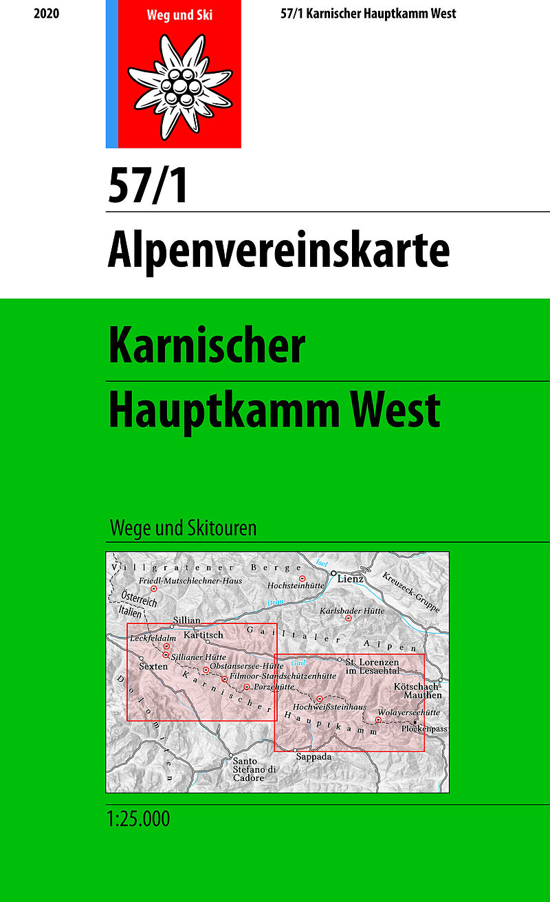 Topographische Karte 1:25.000 in doppelseitiger Ausführung, mehrfarbig, mit Wegmarkierungen, Skirouten, Bushaltestellen, Schummerung, Felszeichnung, Gletscherdarstellung, Kennzeichnung der Klettersteige, UTM-Gitter. Gebiet: Von Sexten im Westen bis Plöckenpass...