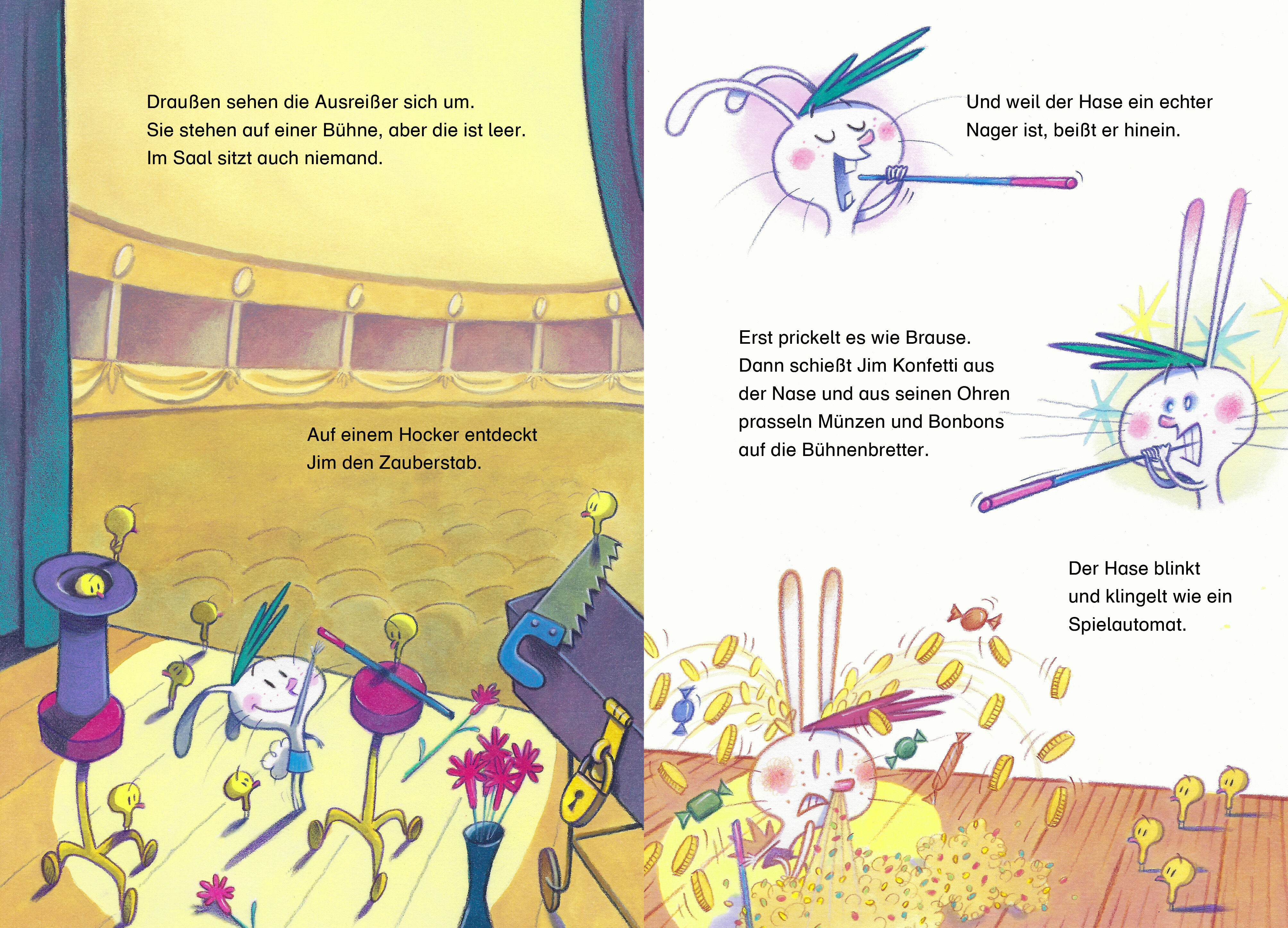 Nach Cowboy Klaus jetzt Hase Jim Salabim Simsalabim, der Hase Jim! Im schwarzen Hut des berühmten Zauberers Mogel-Strauß warten die Tiere auf ihren großen Auftritt. Auch der Hase Jim Salabim. Doch warum ist es so schrecklich eng in diesem Hut? Jim beschließt a...