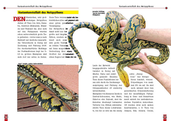 Netzpythons sind absolute Traumtiere für Schlangenfreunde mit genügend Platz und Erfahrung. Schon Farbenpracht und Musterung der Naturformen sind herrlich, doch mittlerweile werden diese Pythons auch in verschiedensten, fantastisch schönen Farb- und Zeichnungs...