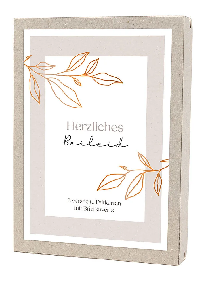 Box mit 6 versch. Faltkarten und Umschlägen für Trauer Format der Box: 13,3 x 18,2 x 3 cm. Die Karten sind auf Naturpapier gedruckt und mit Kupferfolie veredelt.