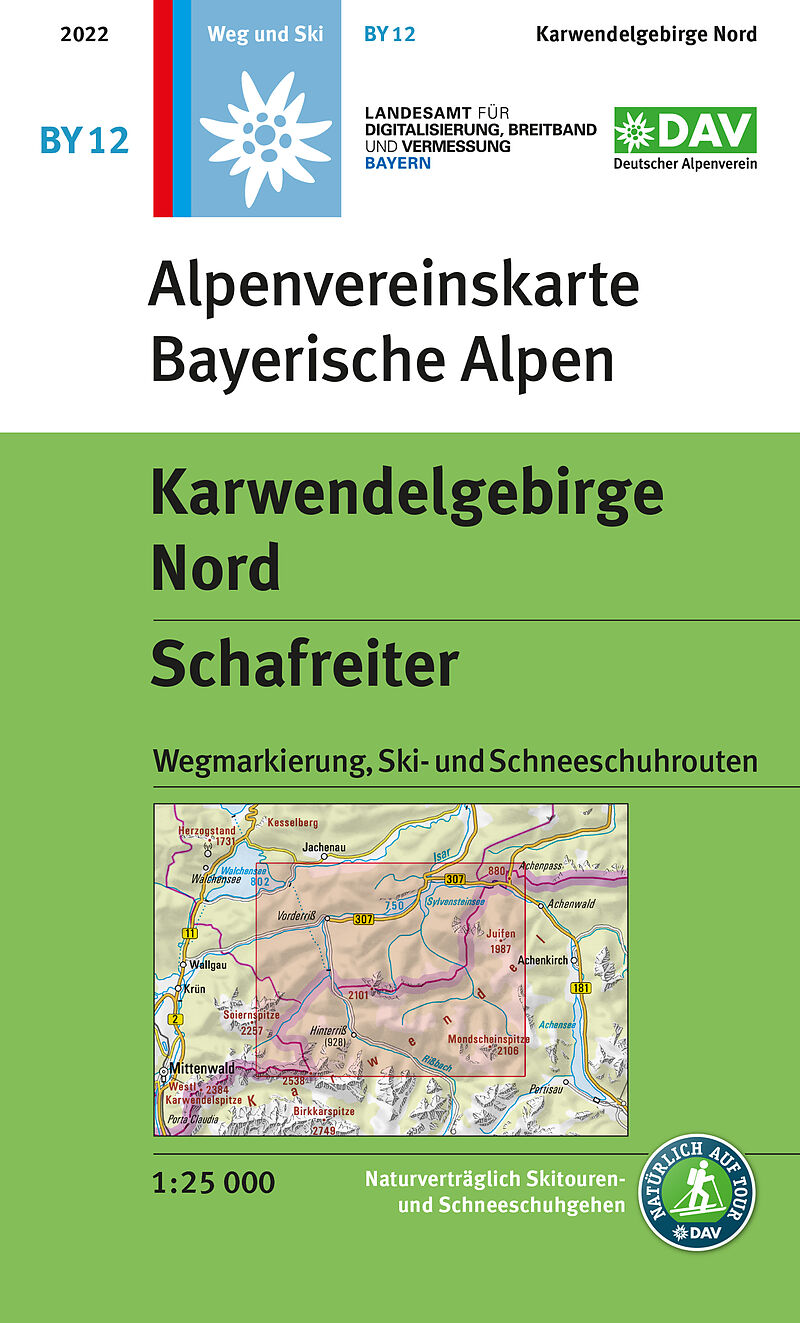 Topographische Karte Bayern 1:25.000, mehrfarbig, mit Wegmarkierungen, Skirouten, Schneeschuhrouten, Schutzgebiete, Bushaltestellen, Schummerung, Felszeichnung, Kennzeichnung der Klettersteige, UTM-Gitter. Gebiet: Nördliches Karwendel von Walchensee bis Montsc...