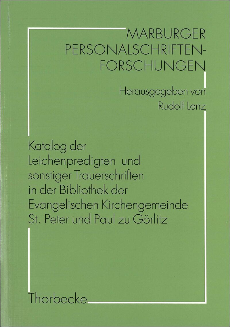 In Band 31 der Reihe Marburger Personalschriften-Forschungen sind die Leichenpredigten und sonstigen Trauerschriften der Bibliothek der Evangelischen Kirchengemeinde St. Peter und Paul zu Görlitz verzeichnet. Die Bearbeitung von Konvoluten mit Leichenpredigte...