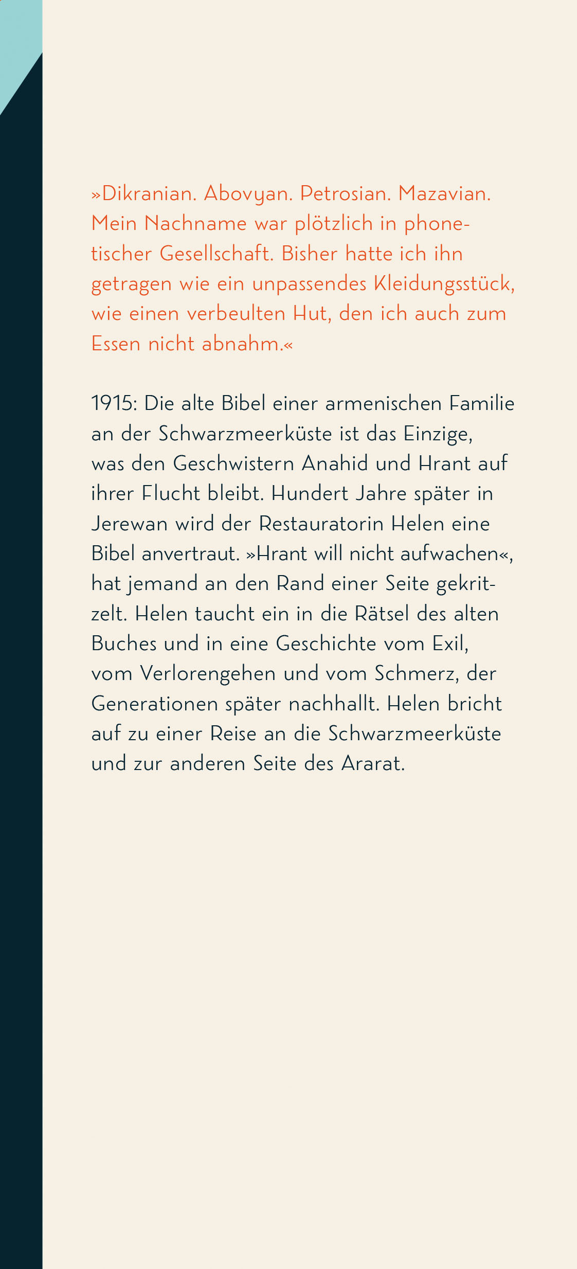 Longlist - nominiert für den Deutschen Buchpreis 2019 »Dikranian. Abovyan. Petrosian. Mazavian. Mein Nachname war plötzlich in phonetischer Gesellschaft. Bisher hatte ich ihn getragen wie ein unpassendes Kleidungsstück, wie einen verbeulten Hut, den ich auch ...