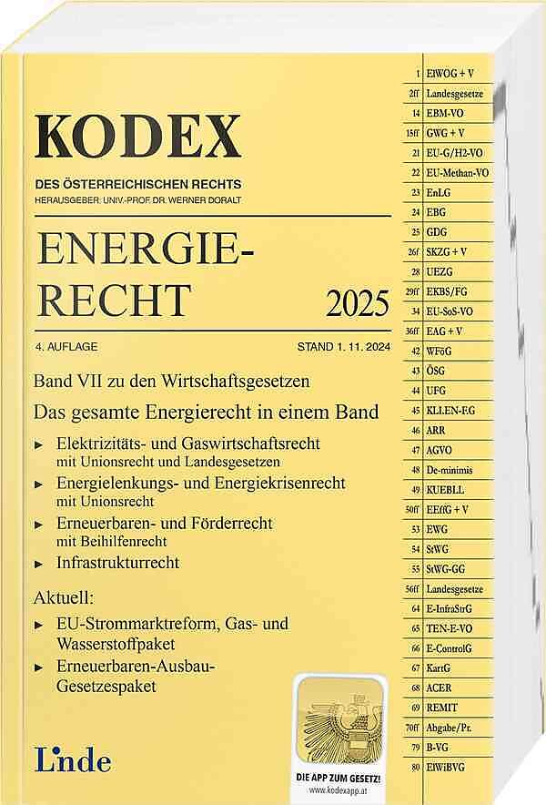 Auflage, Stand 1.11.2024 Mit der App zum Gesetz Band VII zu den Wirtschaftsgesetzen Das gesamte Energierecht in einem Band Aktuell: EU-Strommarktreform, Gas- und Wasserstoffpaket Erneuerbaren-Ausbau-Gesetzespaket KODEX Energierecht 2025 4. Auflage, Stand 1...