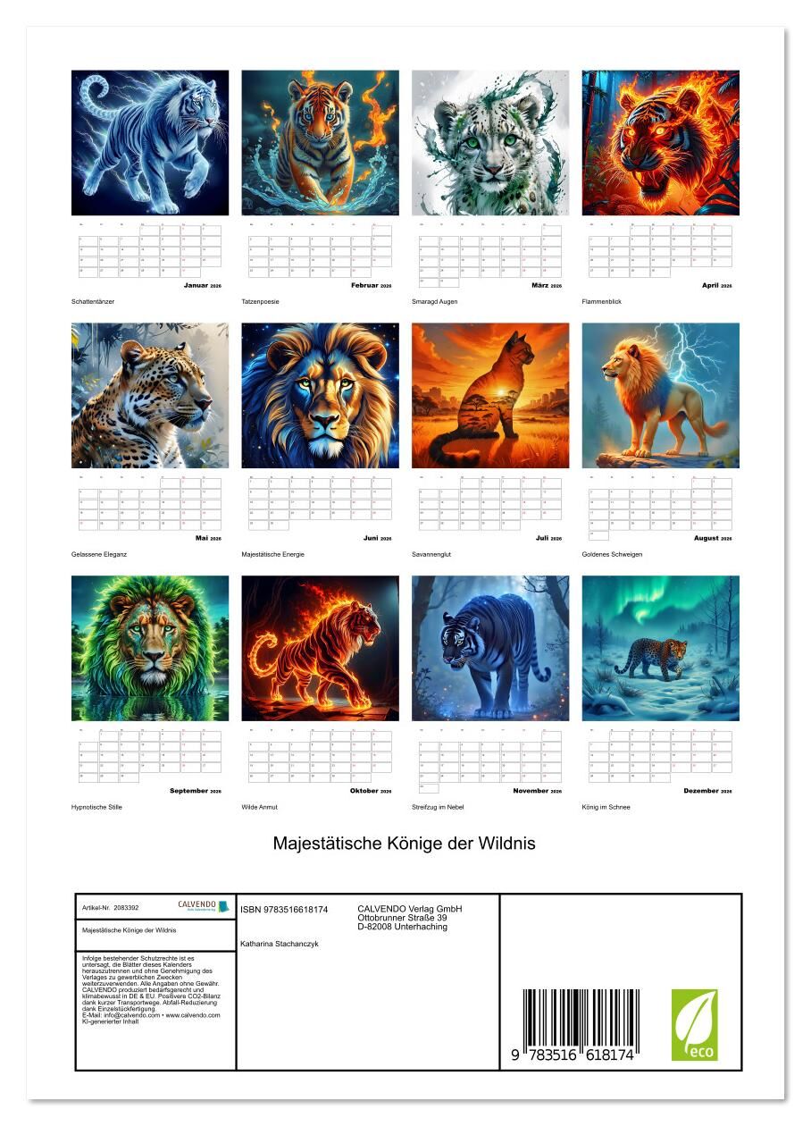 Lass dich ein Jahr lang begleiten von der stillen Macht und wilden Schönheit der majestätischsten Raubtiere. Dieser mit KI gestalteter Kalender entführt dich in die geheimnisvollen Reiche von Savanne, Dschungel und Schnee. Erlebe Löwen, Leoparden und Tiger in ...