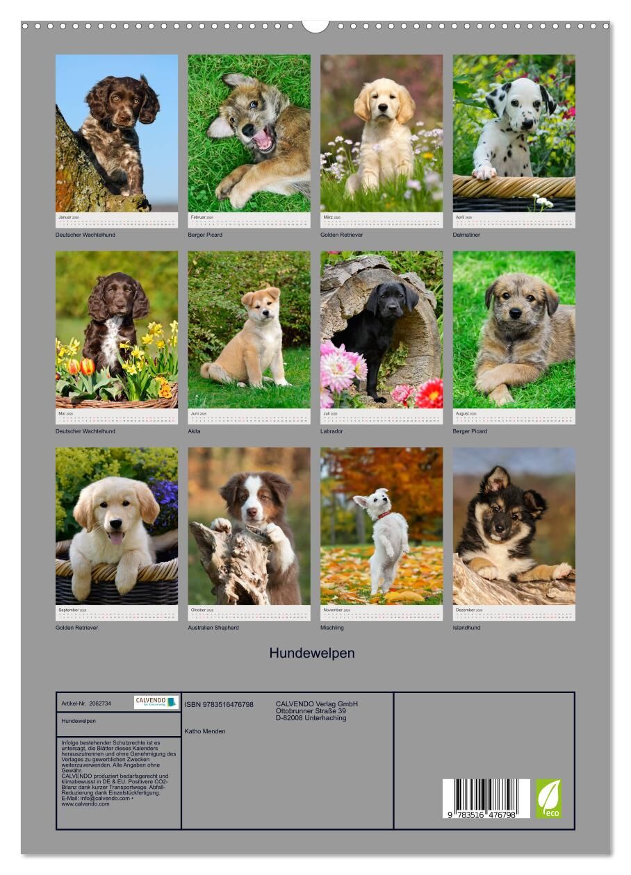 Hundekinder schauen Dich mit treuen Augen an. Niedliche Welpenbilder verschiedener Hunderassen (Islandhund, Wachtelhund, Berger Picard, Golden Retriever, Dalmatiner, Akita, Labrador, Australian Shepherd) begleiten den Hundefreund durch das ganze Jahr Hundekind...
