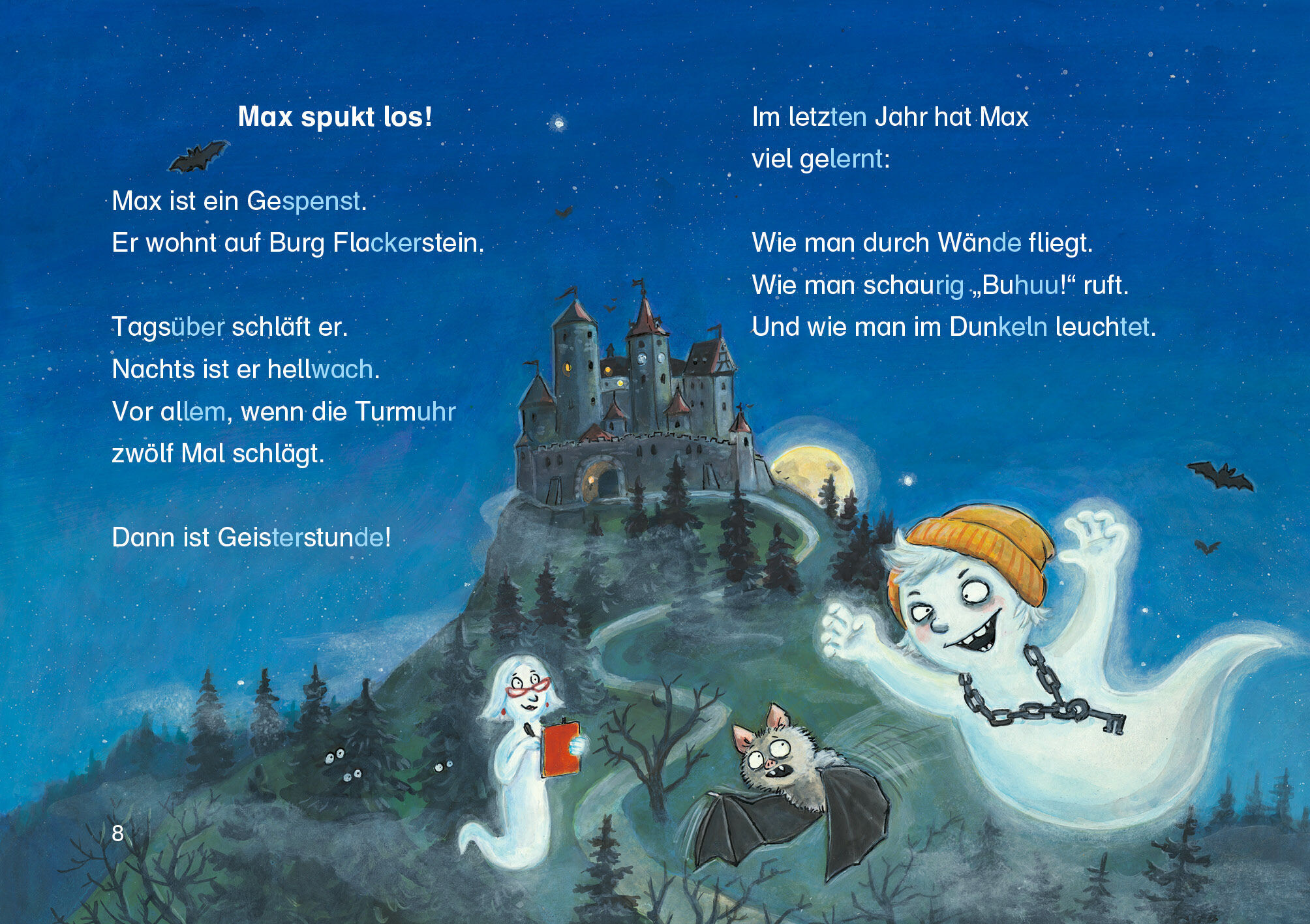 Aufregung im Spukschloss! Als die großen Gespenster zu einem wichtigen Kongress verreisen müssen, freuen sich Max und seine Freunde Lu und Husch sehr darauf, in ihrer Abwesenheit die mitternächtliche Gruselstunde auf Burg Flackerstein zu übernehmen. Doch auf e...