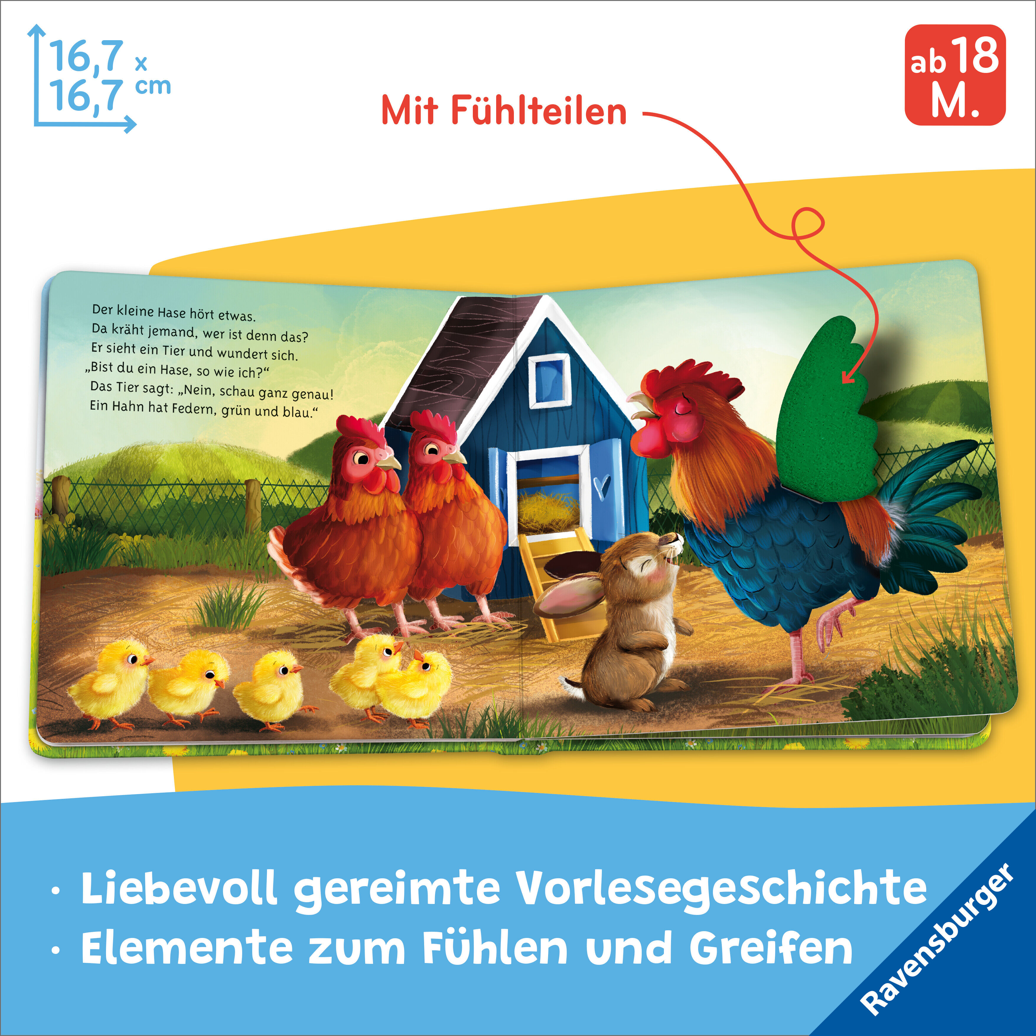 Vorlesen, Fühlen und Staunen Diese liebevolle Vorlesegeschichte nimmt Kinder ab 18 Monaten mit auf eine spannende Entdeckungsreise. Zusammen mit dem kleinen Hasen erkunden sie den Bauernhof. Dabei begegnen ihnen viele verschiedene Tiere. Und die können die Kle...