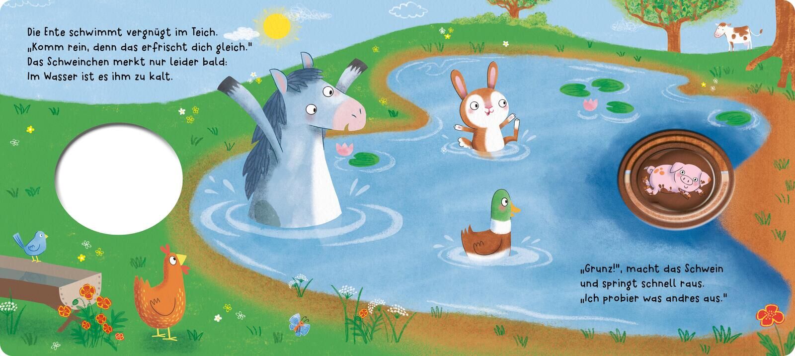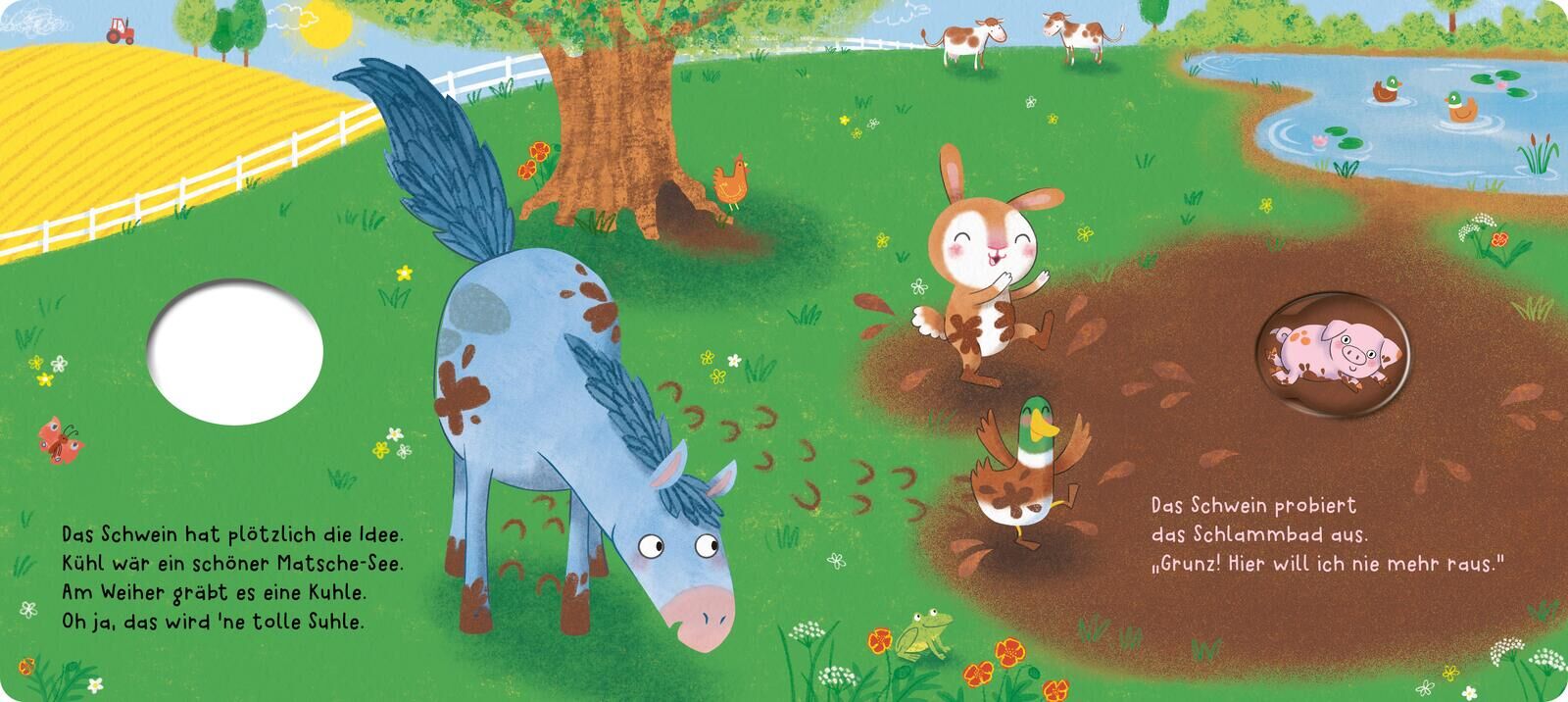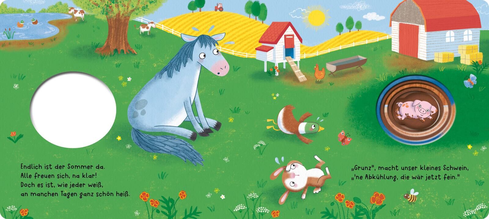 Innovatives Mitmach-Pappebuch: Zieh am Stoff-Schweinchen und es macht Grunz! Puh, was für ein heißer Tag auf dem Bauernhof! Grunz, ruft das kleiner Schwein, 'ne Abkühlung, die wär jetzt fein! Seine Freunde haben jede Menge Ideen, aber nichts davon fühlt sich ...
