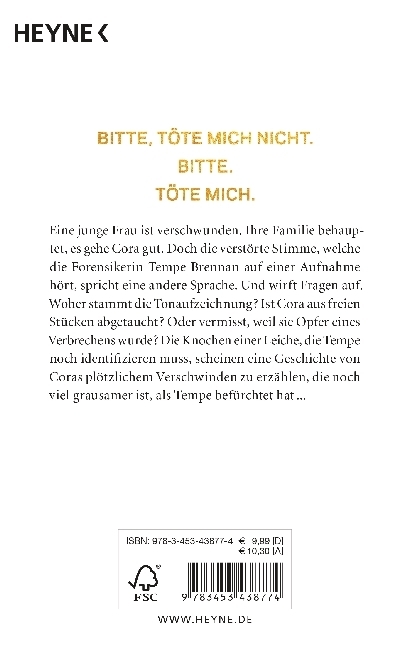 Eine junge Frau ist verschwunden. Ihre Familie behauptet, es gehe Cora gut. Doch die verstörte Stimme, die Forensikerin Tempe Brennan auf einer Aufnahme hört, spricht eine andere Sprache. Und wirft Fragen auf. Woher stammt die Tonaufzeichnung? Ist Cora aus fre...