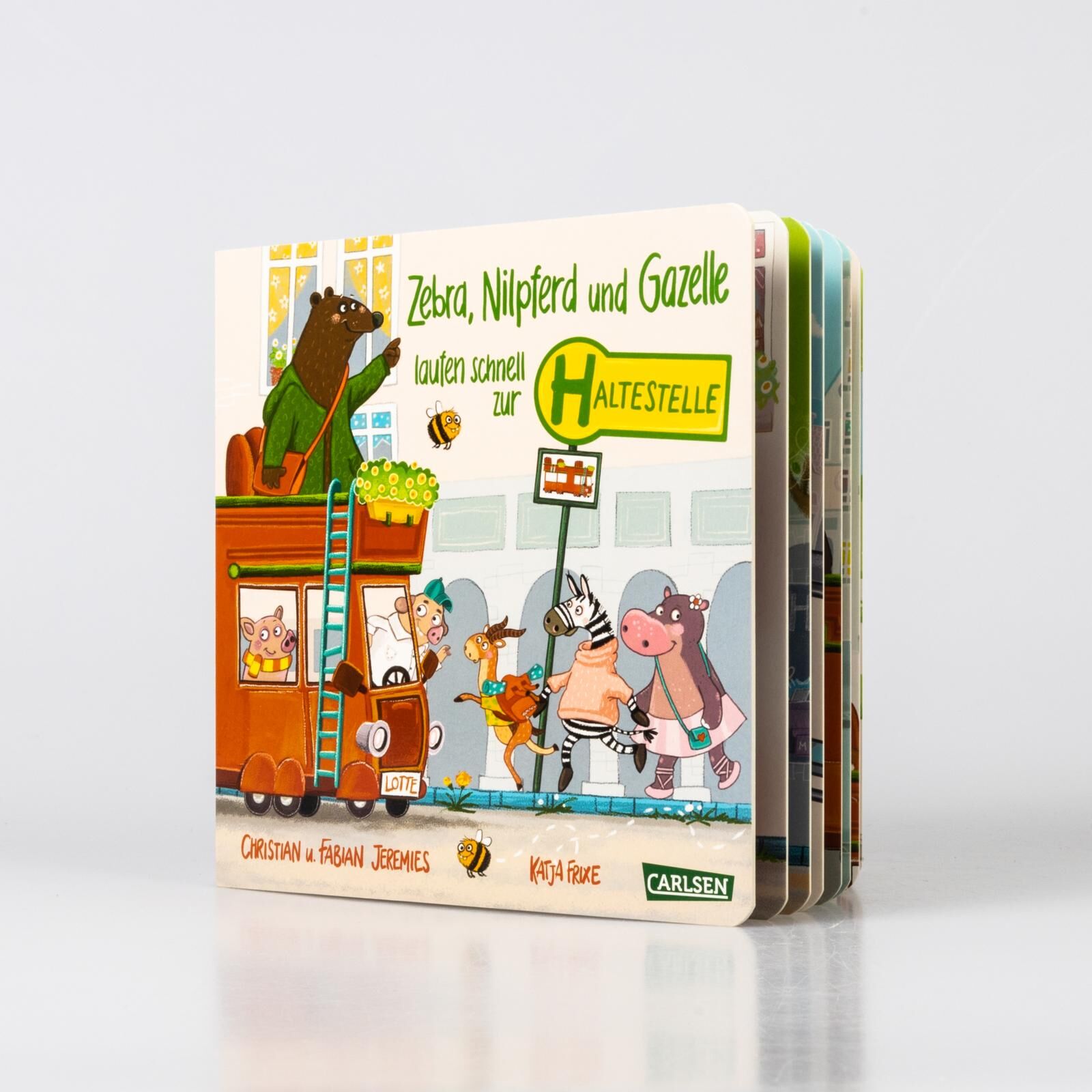 Zebra, Nilpferd und Gazelle laufen schnell zur ... Haltestelle!
