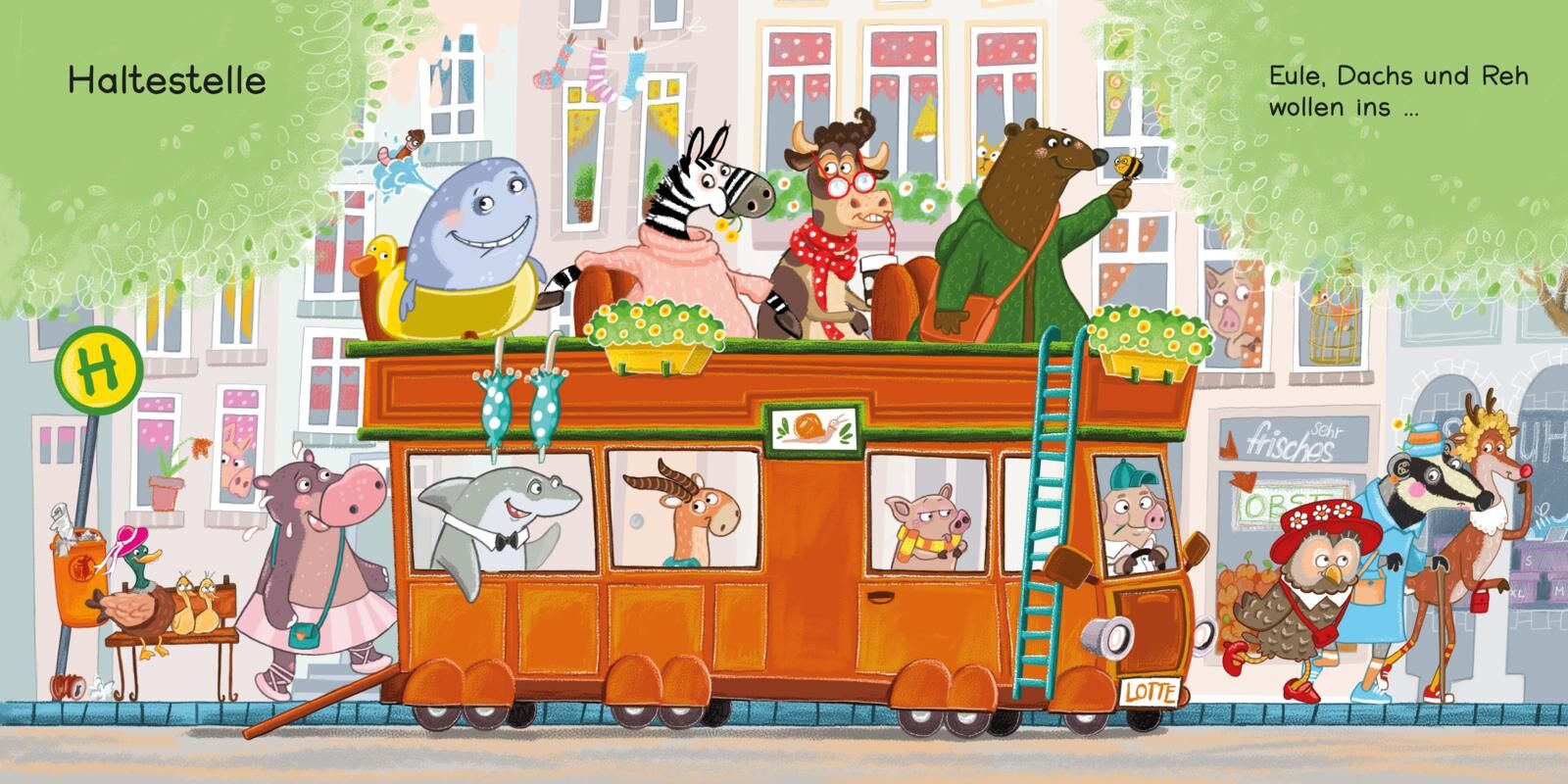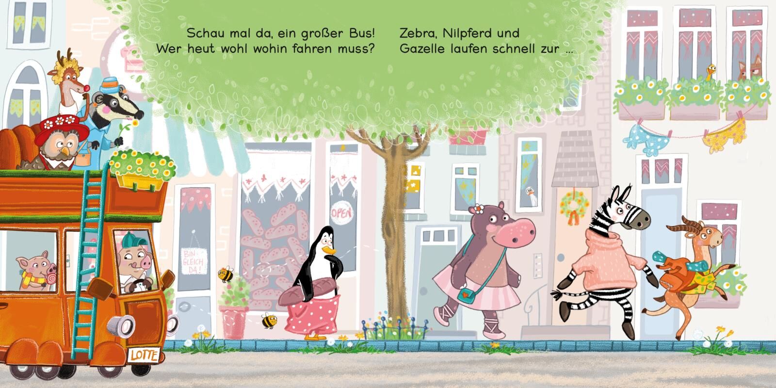 Schau mal da, ein großer Bus! Wer heut wohl wohin fahren muss? An der Haltestelle ist tierisch was los: Hier warten viele deiner Lieblingstiere und jede Menge Reime-Spaß auf dich! Welche Tiere steigen in den Bus ein? Was ist die nächste Station? Wer steigt an...