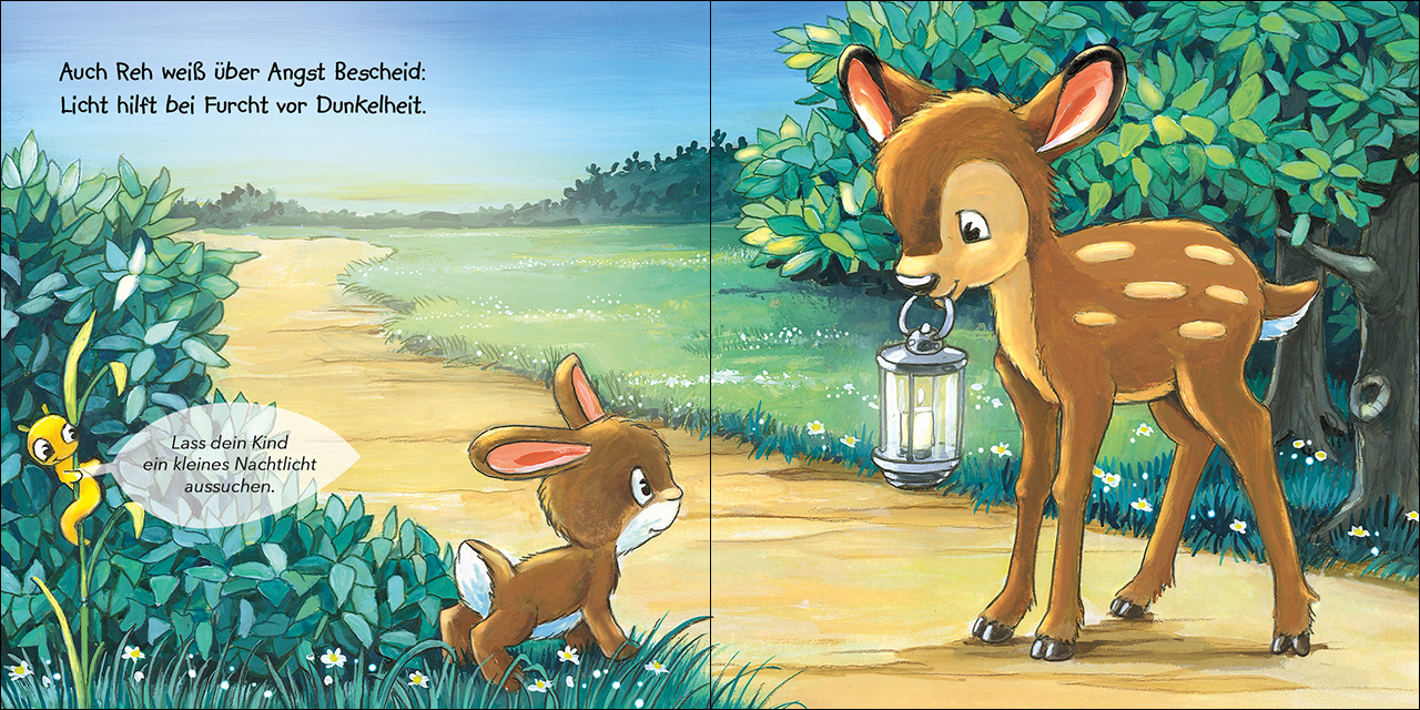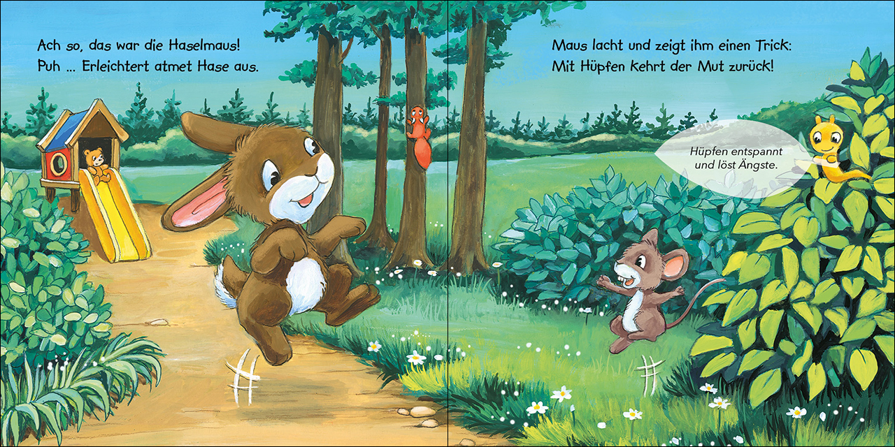 Der kleine Hase will vom Spielen nach Hause gehen. Doch es wird langsam dunkel und Häschen bekommt Angst. Zum Glück sind die anderen Tiere sofort da und wissen genau, wie man die blitzschnell vertreibt! So ermutigt und gestärkt läuft Hase sicher und schnell zu...