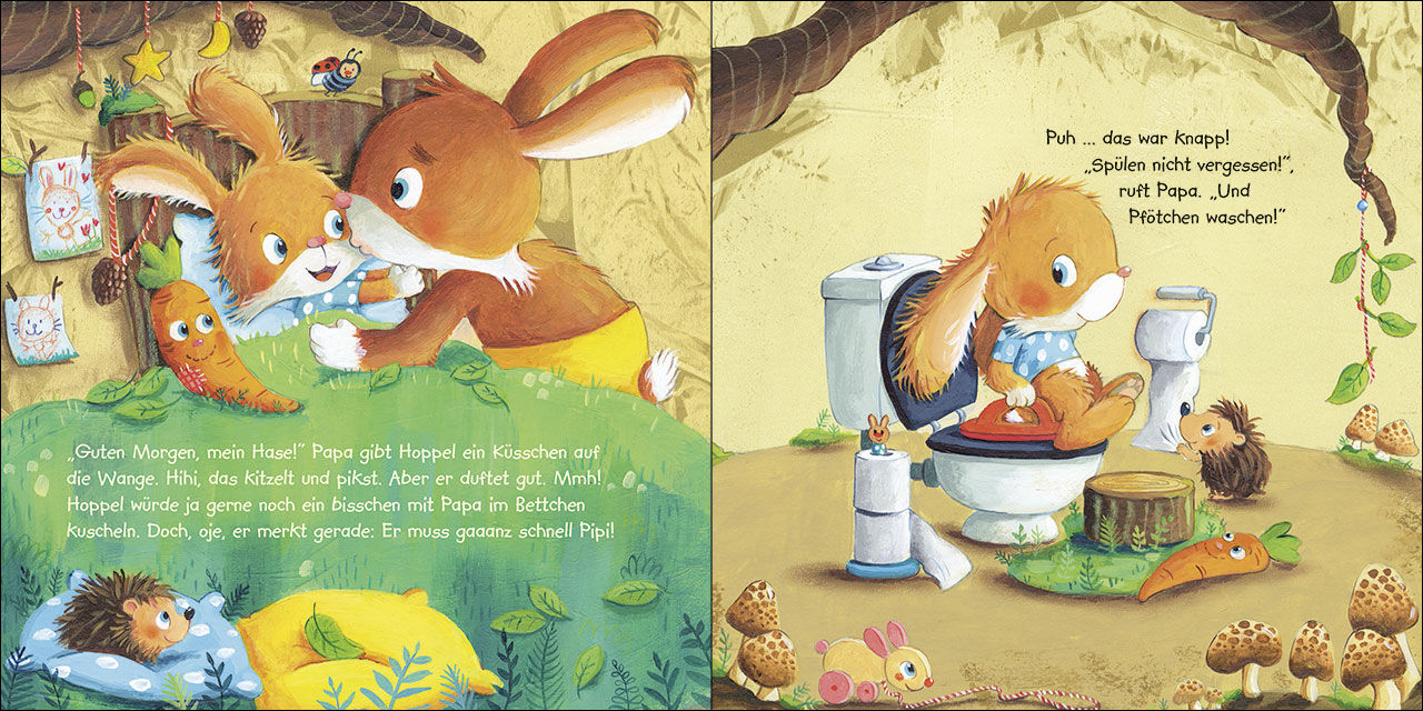 Nach dem Aufstehen muss Hoppel erstmal dringend aufs Klo. Händewaschen nicht vergessen! Aber Fellbürsten möchte Hoppel nicht, denn die Bürste pikst bestimmt oder? Und überhaupt: Zähneputzen, waschen, Nägel schneiden, muss das wirklich sein? Ja, aber mit etwas...