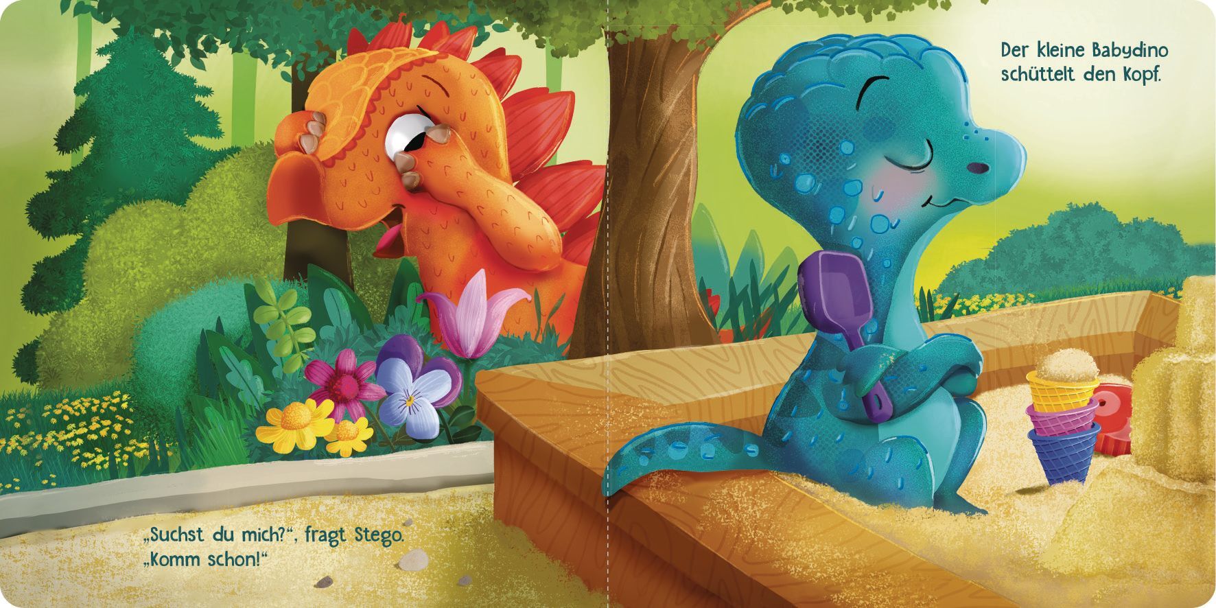 Kunterbunt glänzende, allererste Pappbilderbuch-Abenteuer mit lustigen Fantasie-Babytieren Bronto buddelt allein im Sand. Er hat keine Lust mit Trica Fangen spielen oder mit Stego Verstecken. Auch ein Wettrennen ist nichts für ihn. Zum Glück haben seine Freund...
