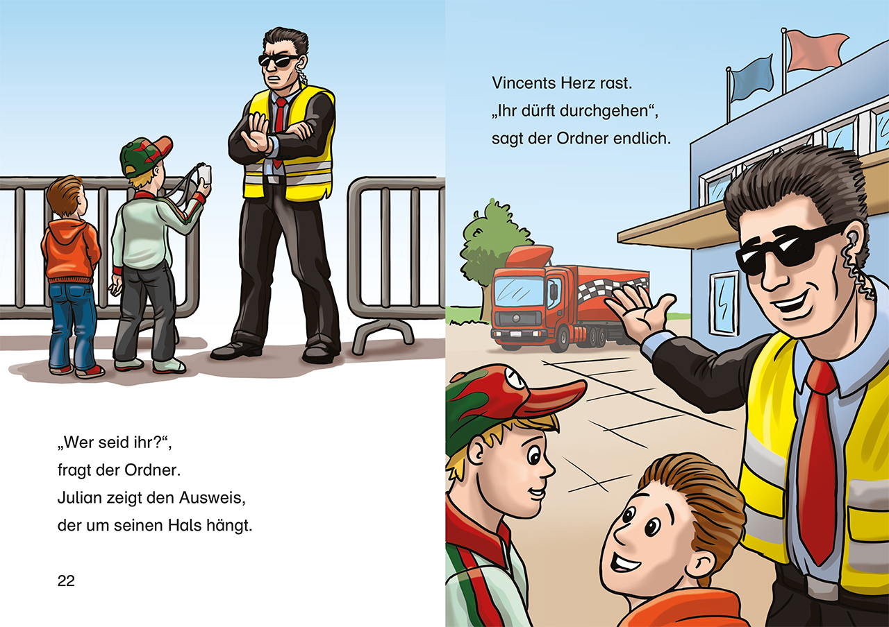 mit Spotlack und Stickerbogen Vincent geht zu seinem ersten Autorennen und kann sein Glück kaum fassen: Er darf in die Boxengasse und lernt einen echten Rennfahrer kennen! Als der seinen Glücksbringer nicht findet, schenkt ihm Vincent sein kleines rotes Spiela...