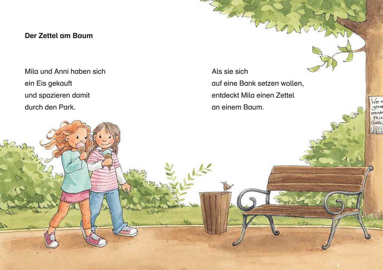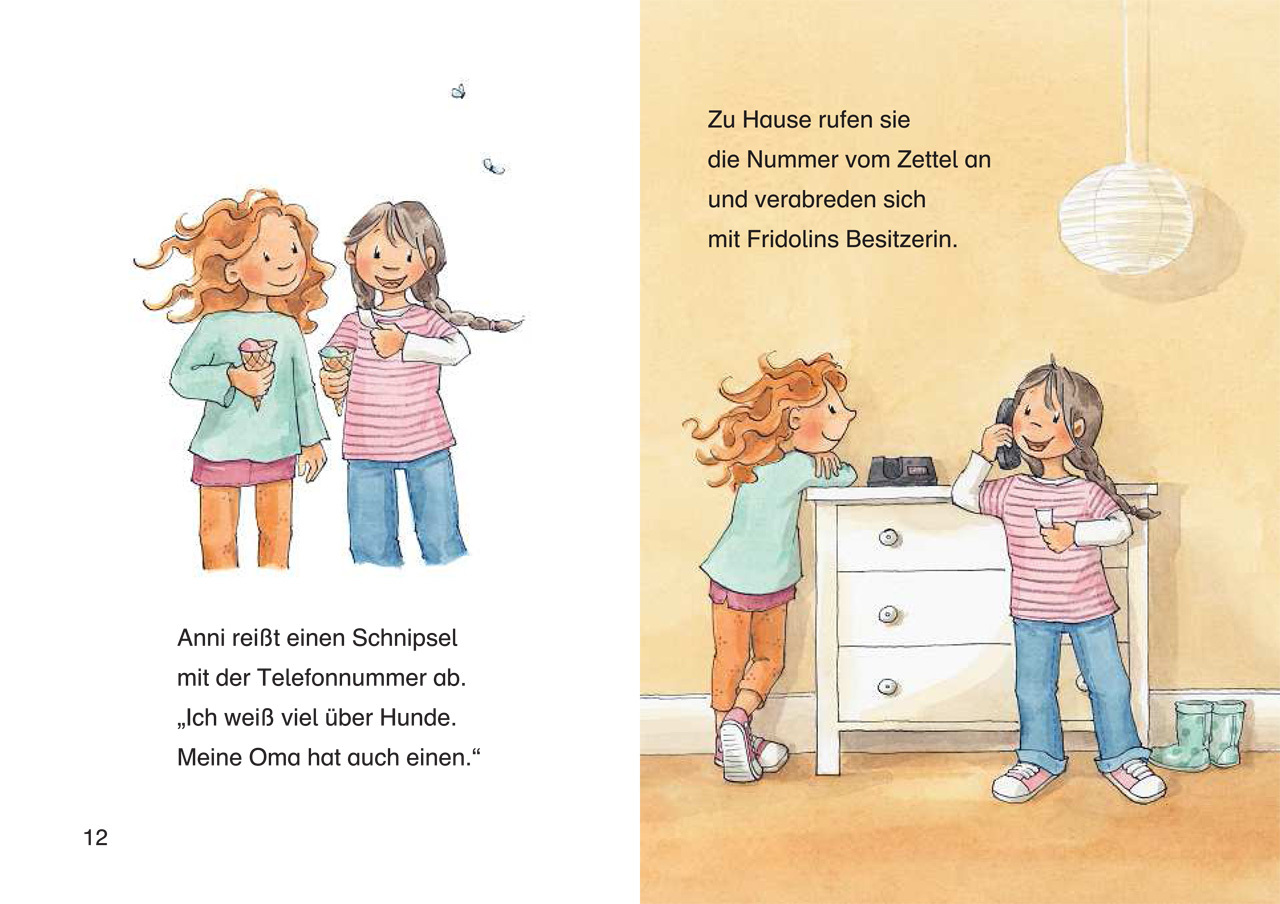 mit Spotlack und Stickerbogen Juhu! Anni und Mila dürfen den Hund Fridolin ausführen. Doch dann streiten sie sich um die Leine und Fridolin büxt aus. Sofort halten die Mädchen wieder zusammen und fragen überall nach dem entlaufenen Hund. Am Ende der Suche entd...