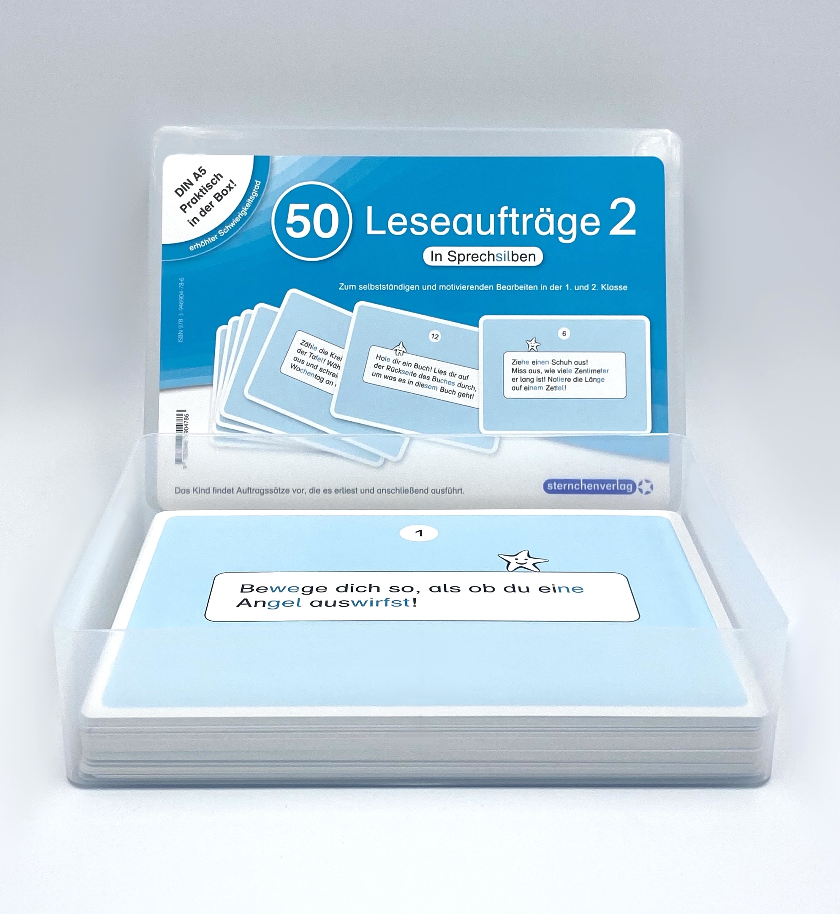 Jetzt neu Teil 2 in Sprechsilben! Mit Etikett gratis dazu! Der Schüler findet längere Auftragssätze vor, die er erlesen und anschließend ausführen muss. 50 Leseaufträge im großen DIN A5-Format in der passenden Box - für die 1. und 2. Klasse