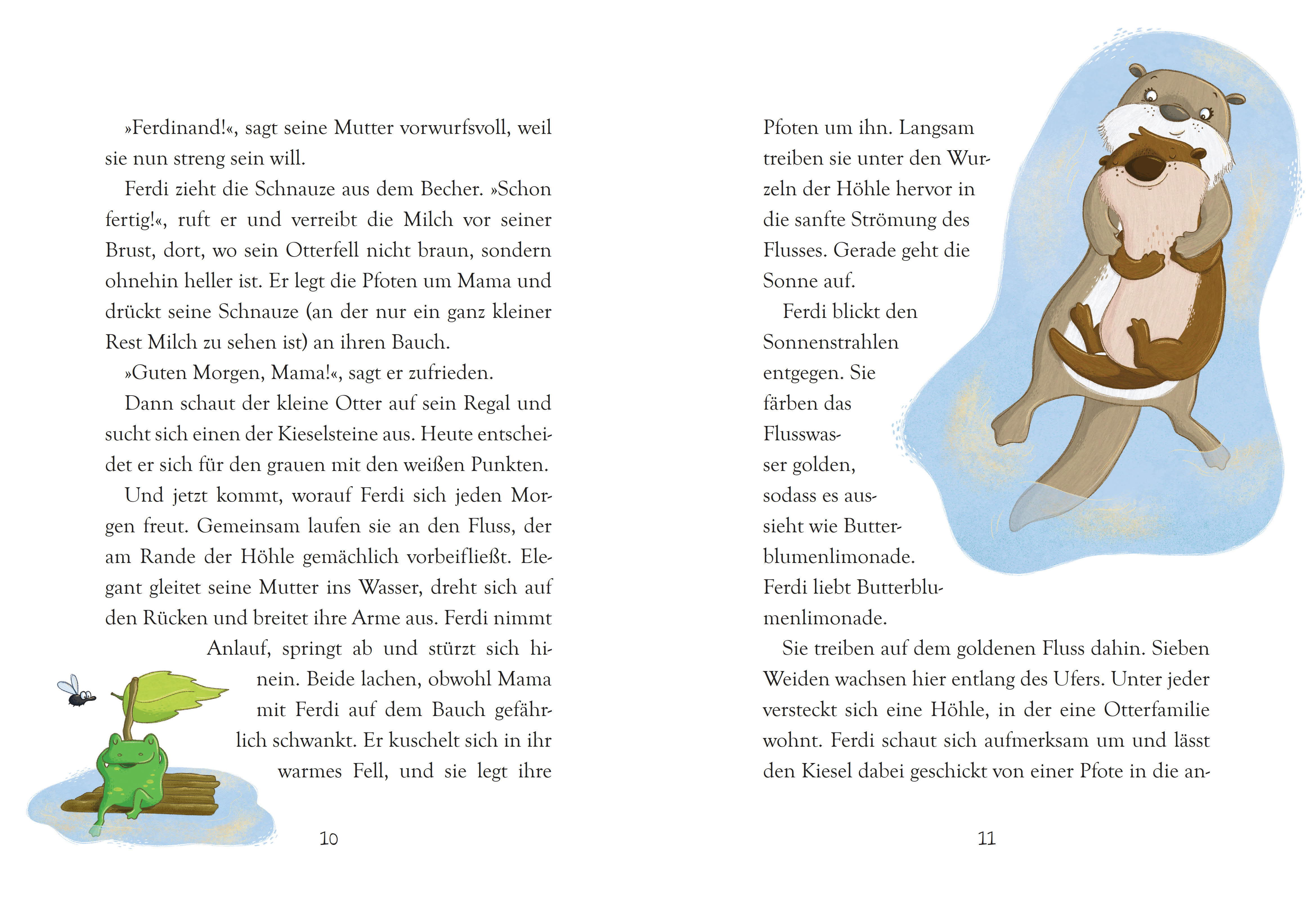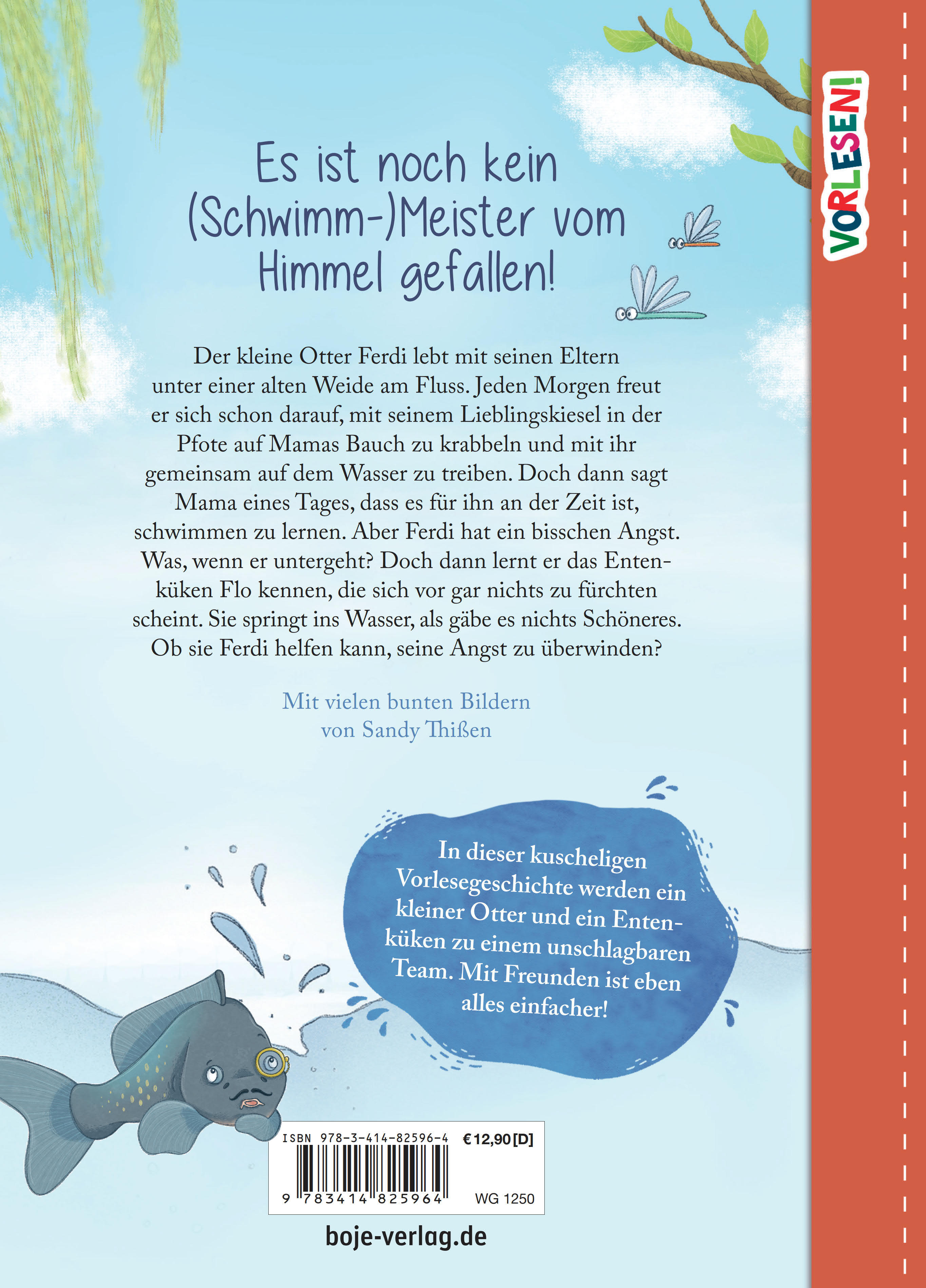Ferdi & Flo Der kleine Otter Ferdi soll schwimmen lernen. Dabei ist es so gemütlich, auf Mamas Bauch über den Fluss zu treiben! Und ein bisschen fürchtet Ferdi sich auch. Was, wenn er untergeht? Doch dann lernt er das mutige Entenküken Flo kennen, das ihm nich...