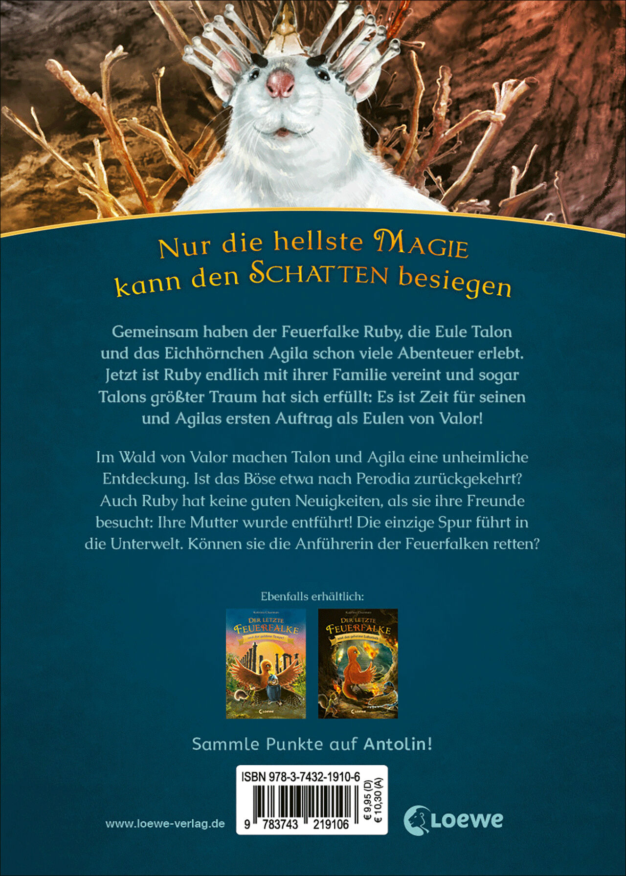 Nur die hellste MAGIE kann den SCHATTEN besiegen Gemeinsam haben der Feuerfalke Ruby, die Eule Talon und das Eichhörnchen Agila schon viele Abenteuer erlebt. Jetzt ist Ruby endlich mit ihrer Familie vereint und sogar Talons größter Traum hat sich erfüllt: Es i...