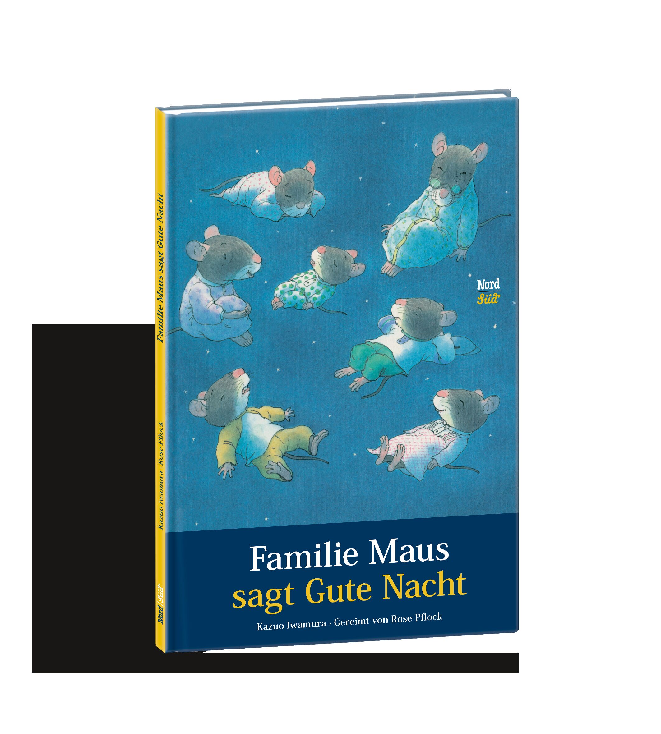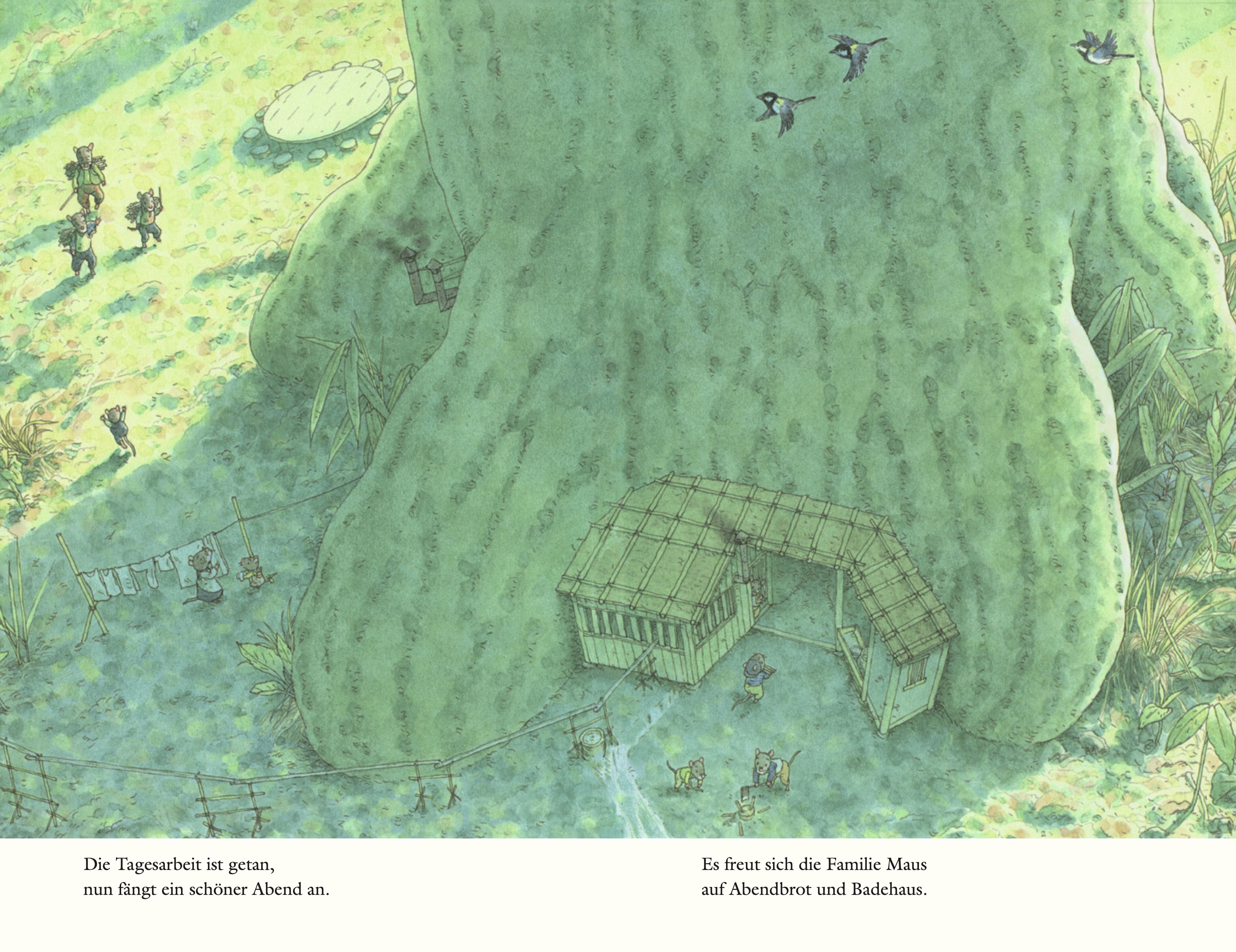 Die Abendsonne wirft lange Schatten. Da trudelt die ganze Familie Maus langsam wieder zu Hause ein. Im Mäusehaus trifft man emsige Vorbereitungen vor dem Zubettgehen: Es wird gebadet, gegessen, erzählt. Natürlich hören die Mäusekinder noch spannende Gutenacht...