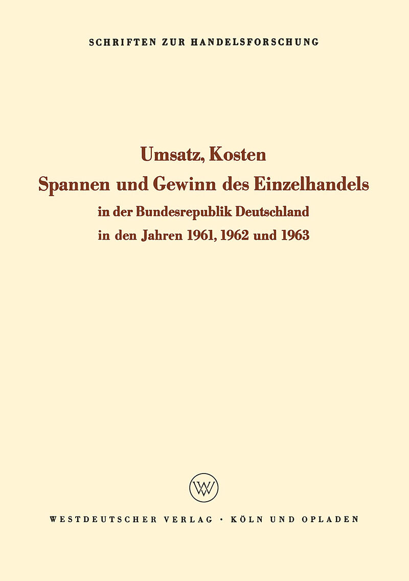 Textteil.- A. Methode des Betriebsvergleichs.- 1. Erhebungsteilnehmer.- 2. Erhebungsgrundlagen.- 3. Erhebungsdurchführung.- 4. Auswertungsverfahren.- 5. Auswertungsberechnungen.- 6. Auswertungsbekanntgabe.- 7. Erläuterungen der bei der Erhebung und der Auswertung verwandten Begriffe in alphabetischer Anordnung.- B. Charakterisierung der am Betriebsvergleich teilnehmenden Firmen.- 1. Branchengliederung.- 2. Größenklassengliederung.- 3. Örtliche Verteilung nach Ländern, Ortsgrößen und Geschäfrslagen.- 4. Größe des Geschäfrsraumes.- 5. Personenzahl und Personengliederung.- 6. Zusammensetzung der Warensortimente.- 7. Repräsentationsgrad der am Betriebsvergleich beteiligten Betriebe.- C. Umsatz, Kosten, Spannen und Gewinn in Jahreszahlen.- 1. Beschaffung, Lagerung, Absatz und Handlungskosten im Gesamtvergleich.- 2. Beschaffung.- 3. Lager.- 4. Absatz.- a) Absatzleistungszahlen.- b) Absatzarten.- c) Kreditverkäufe und Außenstände.- 5. Handlungskosten.- 6. Betriebshandelsspanne und Betriebsergebnis.- 7. Absatz-, Lager-, Kosten- und Ertragszahlen nach Personenabsatzklassen.- 8. Beschaffungs-, Lager-, Absatz-, Kosten- und Ertragszahlen nach den Standortmerkmalen Land und Ortsgröße.- D. Umsatz und Kosten in Monats- und Quartalszahlen.- 1. Beschaffungs-, Lager- und Absatzindex für die vier Hauptgruppen des Einzelhandels und den gesamten Einzelhandel.- 2. Vierteljährliche Branchen- und Teilbranchenzahlen der Beschaffung, des Absatzes und der Handlungskosten.- E. Veröffentlichungen des Instituts für Handelsforschung über den Betriebsvergleich in den Jahren 1961, 1962 und 1963.- Tabellenteil.- Tabelle 1: Gliederung der in den Jahresauswertungen 1961, 1962 und 1963 erfaßten Teilnehmer am Betriebsvergleich des Einzelhandels nach Branchen und Teilbranchen.-Tabelle 2: Gliederung der in den Jahresauswertungen 1961, 1962 und 1963 erfaßten Teilnehmer am Betriebsvergleich des Einzelhandels nach Branchen und Personengrößenklassen.- Tabelle 3: Gliederung der in den Jahresauswertungen 1961, 1962 und 1963 erfaßten Teilnehmer am Betriebsvergleich des Einzelhandels nach Branchen und Absatzgrößenklassen.- Tabelle 4: Gliederung der in den Jahresauswertungen 1961, 1962 und 1963 erfaßten Teilnehmer am Betriebsvergleich des Einzelhandels nach Branchen und Ländern.- Tabelle 5: Gliederung der in den Jahresauswertungen 1961, 1962 und 1963 erfaßten Teilnehmer am Betriebsvergleich des Einzelhandels nach Branchen und Ortsgrößen.- Tabelle 6: Gliederung der in den Jahresauswertungen 1961, 1962 und 1963 erfaßten Teilnehmer am Betriebsvergleich des Einzelhandels nach Branchen und Geschäftslagen.- Tabelle 7: Die Größe des Geschäftsraumes je Einzelhandelsbetrieb in Quadratmetern im Durchschnitt der Branchen und Personengrößenklassen in den Jahren 1961, 1962 und 1963.- Tabelle 8: Die Größe des Geschäftsraumes je Einzelhandelsbetrieb in Quadratmetern im Durchschnitt der Branchen und Absatzgrößenklassen in den Jahren 1961, 1962 und 1963.- Tabelle 9: Die Zahl der beschäftigten Personen je Einzelhandelsbetrieb im Durchschnitt der Branchen und Personengrößenklassen in den Jahren 1961, 1962 und 1963.- Tabelle 10: Die Zahl der beschäftigten Personen je Einzelhandelsbetrieb im Durchschnitt der Branchen und Absatzgrößenklassen in den Jahren 1961, 1962 und 1963.- Tabelle 11: Der Anteil der Inhaber oder Leiter, der mithelfenden Familienangehörigen, der Lehrlinge und der Werkstattpersonen in Prozenten der Gesamtzahl der Betriebspersonen im Durchschnitt der Branchen in den Jahren 1961, 1962 und 1963.- Tabelle 12: Die Zusammensetzungder Warensortimente nach den Hauptwarengruppen in Prozenten des Absatzes im Durchschnitt der Branchen in den Jahren 1961, 1962 und 1963.- Tabelle 13: Vergleich der im Jahre 1962 am Betriebsvergleich beteiligten Betriebe und des von ihnen erzielten Absatzes mit den entsprechenden Zahlen der Umsatzsteuerstatistik 1962 in der Bundesrepublik Deutschland.- Tabelle 14: Die Entwicklung von Beschaffung, Lager, Absatz und Handlungskosten im Durchschnitt der Branchen in den Jahren 1961, 1962 und 1963 (1949 = 100).- Seite Tabelle 15: Die Entwicklung von Beschaffung, Absatz und Handlungskosten im Durchschnitt der Branchen sowie der Personen- und Absatzgrößenklassen in den Jahren 1961, 1962 und 1963 (1961 = 100).- Tabelle 16: Die Beschaffungswege in Prozenten der gesamten Warenbeschaffung im Durchschnitt der Personengrößenklassen in den Jahren 1961, 1962 und 1963.- Tabelle 17: Die Beschaffungswege in Prozenten der gesamten Warenbeschaffung im Durchschnitt der Absatzgrößenklassen in den Jahren 1961, 1962 und 1963.- Tabelle 18: Die Entwicklung des Lagerbestandes, die Umschlagsgeschwindigkeit des Warenlagers und der Lagerbestand je beschäftigte Person in DM im Durchschnitt der Branchen in den Jahren 1961, 1962 und 1963.- Tabelle 19: Die Umschlagsgeschwindigkeit des Warenlagers im Durchschnitt der Branchen und Personengrößenklassen in den Jahren 1961, 1962 und 1963.- Tabelle 19a: Die Umschlagsgeschwindigkeit des Warenlagers im Durchschnitt der Branchen und Absatzgrößenklassen in den Jahren 1961, 1962 und 1963.- Tabelle 20: Der Lagerbestand je beschäftigte Person in DM im Durchschnitt der Branchen und Personengrößenklassen in den Jahren 1961, 1962 und 1963.- Tabelle 20a: Der Lagerbestand je beschäftigte Person in DM im Durchschnitt der Branchen und Absatzgrößenklassenin den Jahren 1961, 1962 und 1963.- Tabelle 21: Die Gesamtsumme des Absatzes, der Absatz je Betrieb, der Absatz je beschäfrigte Person, der Absatz je Kunde, der Absatz je Quadratmeter Geschäftsraum und der Absatz je qm Verkaufsraum in DM im Durchschnitt der Branchen in den Jahren 1961, 1962 und 1963.- Tabelle 22: Der Absatz je Betrieb in DM im Durchschnitt der Branchen und Personengrößenklassen in den Jahren 1961, 1962 und 1963.- Tabelle 23: Der Absatz je Betrieb in DM im Durchschnitt der Branchen und Absatzgrößenklassen in den Jahren 1961, 1962 und 1963.- Tabelle 24: Der Absatz je beschäftigte Pe