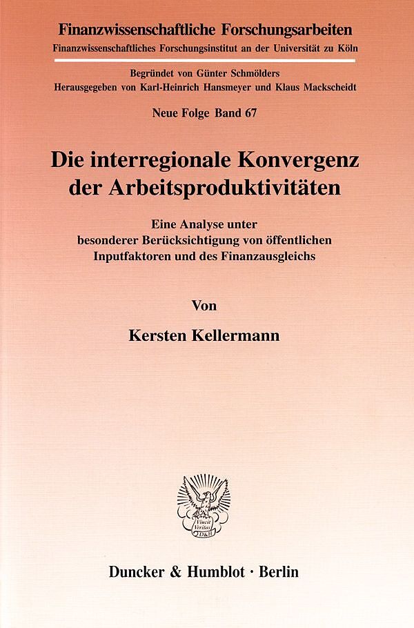 Inhaltsübersicht: A. Einleitung - B. Theoretische und empirische Konvergenzkonzepte: Das neoklassische Wachstumsmodell - Endogene Wachstumsmodelle und Konvergenz - Die offene Volkswirtschaft - Quellen des Wachstums - Empirische Konvergenzkonzepte und ihre Überprüfung - C. Die Wirkung öffentlicher Inputfaktoren auf Wachstum und Konvergenz: Der Staat als Anbieter von Inputfaktoren - Ein-Sektoren-Modell mit öffentlichem und privatem Kapital - Ein Stromgrößenmodell ohne Übergangsdynamik: Das Barro-Modell - Ein Stromgrößenmodell mit Übergangsdynamik - D. Finanzpolitik und regionale Konvergenz der Arbeitsproduktivitäten in der Bundesrepublik Deutschland: Die relative Angleichung der Arbeitsproduktivitäten zwischen den Bundesländern - Konvergenzgleichung - Die verwendeten Daten - Der Schätzansatz und die Schätzergebnisse - E. Finanzausgleich, regionale Effizienz und Konvergenz: Allokative Aspekte eines interregionalen Finanzausgleichs: Neuere Ansätze - Die wertschöpfungsorientierte Einwohnerwertung - Finanzausgleich in einem Zwei-Regionen-Wachstumsmodell - F. Zusammenfassung - Literaturverzeichnis - Sachwortregister