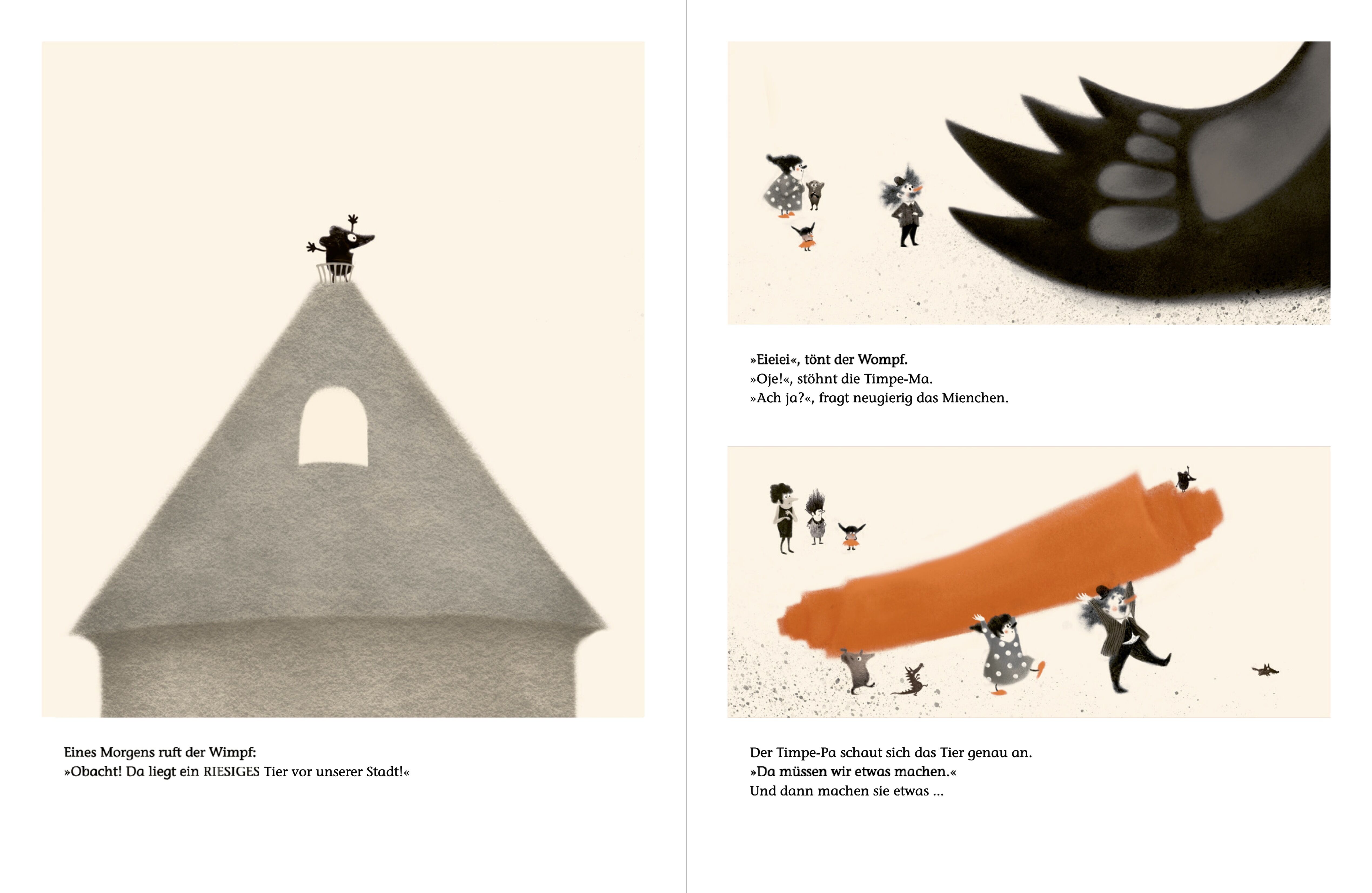 Wie gehen wir mit Unbekanntem um? Eine Geschichte über das miteinander Reden und aufeinander Zugehen Oh nein, vor der Stadt liegt ein riesiges Tier! Es versperrt den Weg. Eieiei, tönt der Wompf. Oje, stöhnt die Timpe-Ma. Da muss etwas gemacht werden! Und dann...