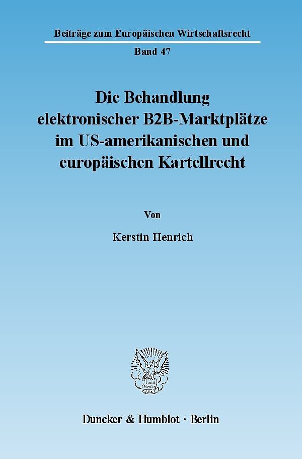 Die Untersuchung ist der Frage gewidmet, ob von elektronischen B2B-Handelsplattformen Gefahren für den Wettbewerb ausgehen könnten. Ihr Schwerpunkt liegt auf der kartellrechtlichen Betrachtung von Marktplätzen, die von führenden Unternehmen einer Branche gegrü...