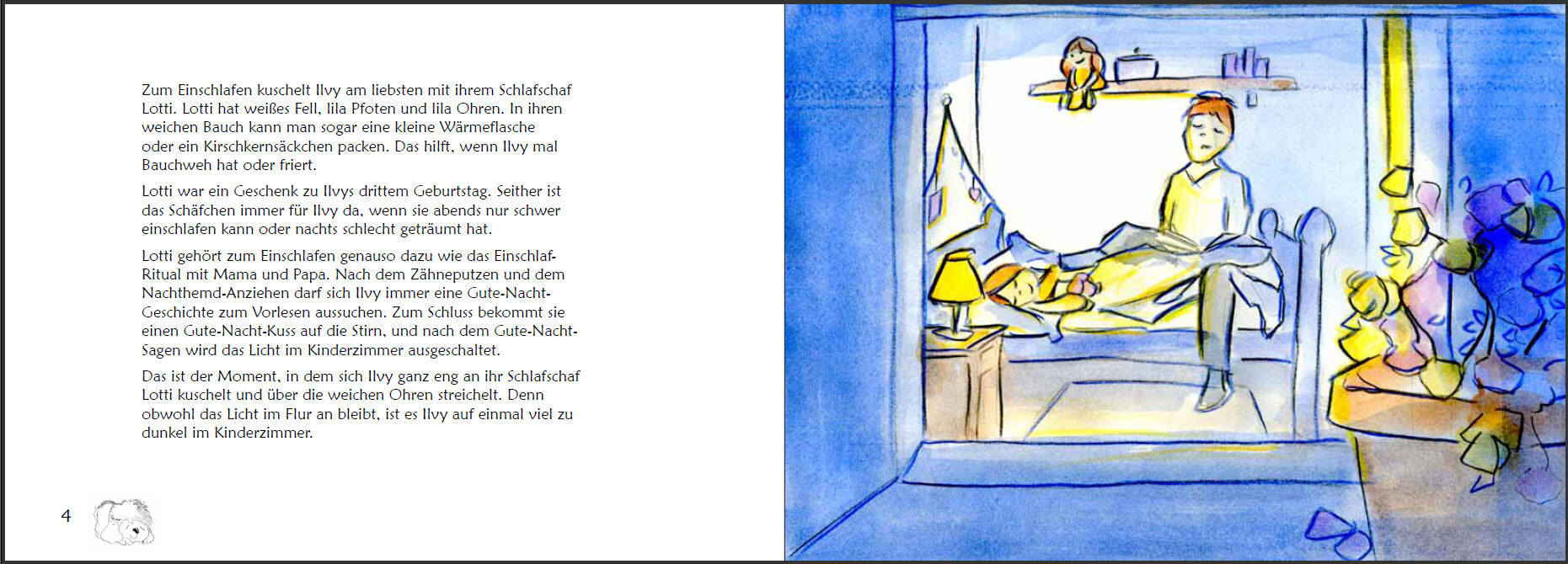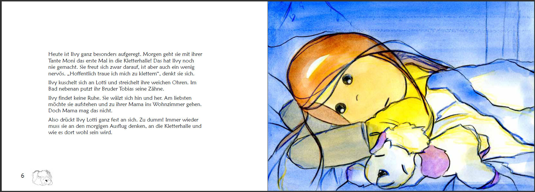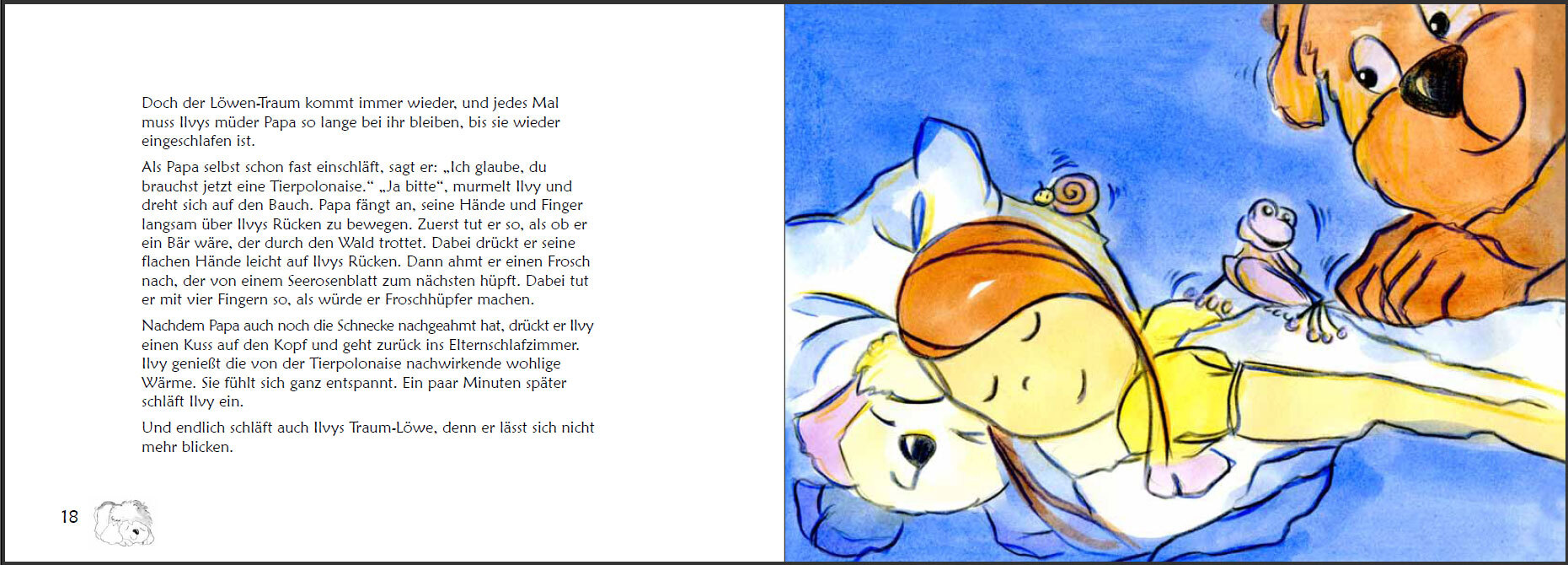 Wie gut, dass heute Sonntag ist. Ilvy bleibt ganz lange im Bett liegen. Dann räkelt sie sich und steht auf. Nach dem Frühstück radelt Ilvy gemeinsam mit Mama zum Spielplatz, während sich Papa um das Mittagessen kümmert. Nachmittags macht sie es sich im Liegestuhl unter dem Apfelbaum bequem. Ohne es zu wollen, schläft sie ein. Wer hätte gedacht, dass sie von der Party noch so k.o. ist. Ilvy schläft bis zum Abendessen. Als sie danach ins Bett soll, mault sie: Manno, ich bin überhaupt nicht müde. Wieso soll ich schon jetzt schlafen gehen? Tobias spielt auch noch ein Computerspiel. Es ist gleich acht Uhr. Das ist deine Schlafenszeit vor einem Schultag. Tobias ist drei Jahre älter als du und braucht deshalb ein bisschen weniger Schlaf, begründet Mama ihre Entscheidung. Wütend stampft Ilvy auf den Boden, wirft Mama einen finsteren Blick zu und geht zum Zähneputzen ins Bad. Nicht, ohne die Tür laut zuzuknallen und zu schimpfen: Jünger sein ist total doof und gemein! Auch im Bett ist Ilvy noch verärgert, da hilft die beste Gute-Nacht-Geschichte nichts. Grantig kuschelt sie sich an Lotti. Zum Glück hat Lotti flauschige Ohren, die Ilvy streicheln kann. Nach einer Weile verschwindet der Ärger und Ilvy schläft ein. Sie träumt von Oma und der Apfelernte, bei der sie jeden Herbst mithilft. Als der letzte Apfel geerntet ist, träumt Ilvy einen neuen Traum: Sie reitet auf einem wunderschönen Einhorn. Doch Hilfe! Plötzlich ist da ein großer Löwe hinter einem Baum. Er reißt sein Maul weit auf, und Ilvy sieht seine fürchterlich scharfen Zähne. Dann setzt der Löwe zum Sprung an. Neeeiiiiiin, nicht!!!, schreit Ilvy ganz laut. So laut, dass Papa total verschlafen zu Ilvy ins Zimmer kommt. Er setzt sich an Ilvys Bett und schaltet nur das kleine Nachtlämpchen ein, damit sich Ilvy besser beruhigen kann. Ilvy, alles in Ordnung?, will Papa wissen. Der Löwe, er, er , weint Ilvy und zittert am ganzen Körper. Das war doch bloß ein Traum, nichts davon ist echt, erklärt Papa, während er Ilvy ganz lange umarmt. Ich habe Angst, dass der Traum weitergeht, wenn ich einschlafe, schluchzt Ilvy. Dann bleibe ich bei dir, bis du wieder gut schläfst, flüstert Papa. Und vergiss nicht, im Traum kannst du alles machen. Du kannst den Löwen sogar in ein Kätzchen verzaubern. Stimmt, murmelt Ilvy. Erleichtert kuschelt sie sich an Lotti und schläft wieder ein. Doch der Löwen-Traum kommt immer wieder, und jedes Mal muss Ilvys müder Papa so lange bei ihr bleiben, bis sie wi…