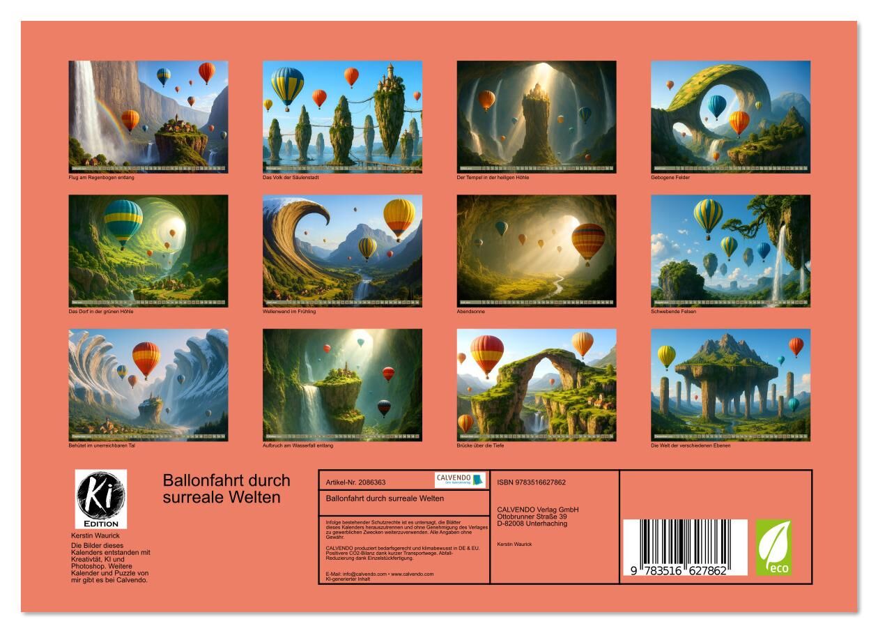 Dieser Kalender entführt dich in surreale Ballonfahrten, bei denen schwebende Farben und unmögliche Landschaften in atemberaubender Weise aufeinandertreffen. Jeder Monat zeigt KI-generierte Szenarien stratosphärische Ballonmeere über traumverzerrten Gipfeln od...