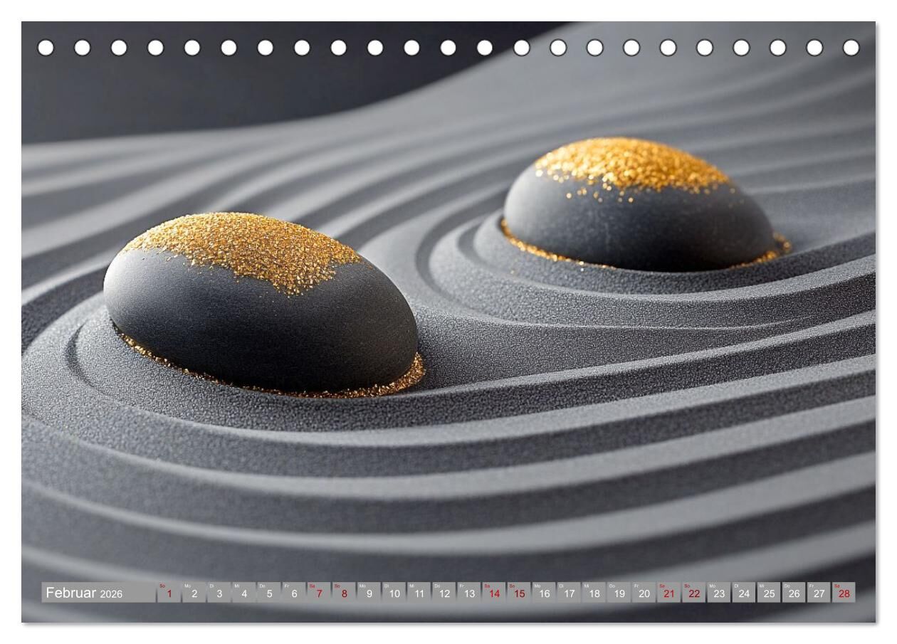 Erleben Sie Zen in neuer Dimension Dieser einzigartige Kalender vereint traditionelle Zen-Gärten mit modernen Farben und kunstvoll arrangierten Steinen. Die sanften Sandwellen und farbigen Steine schaffen eine Atmosphäre der Ruhe und Gelassenheit, die zum Medi...
