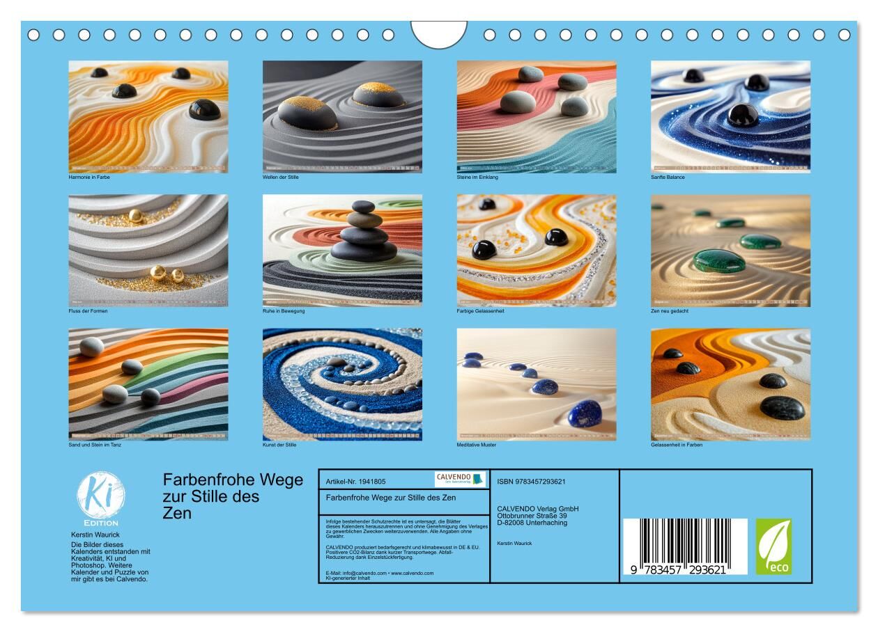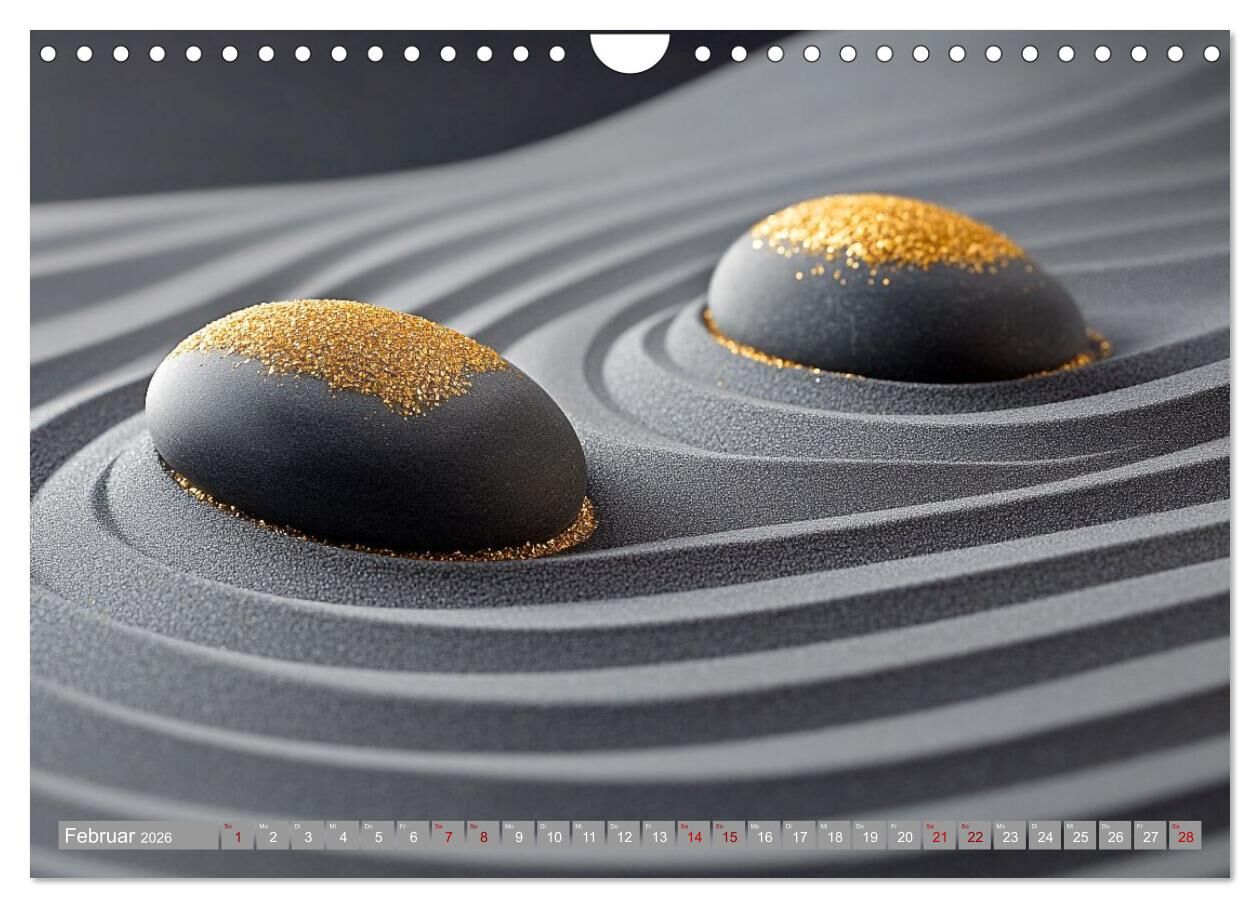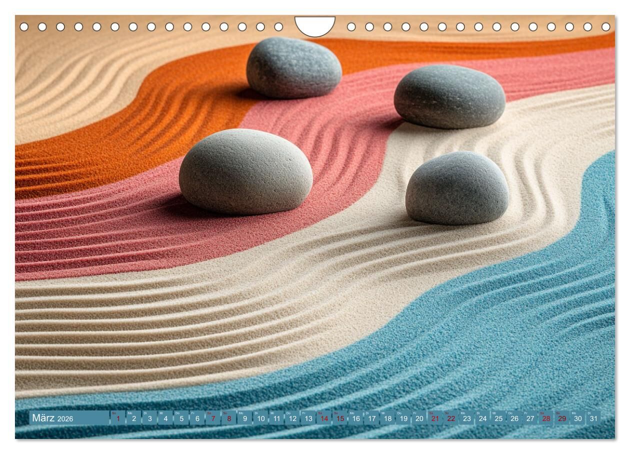 Erleben Sie Zen in neuer Dimension Dieser einzigartige Kalender vereint traditionelle Zen-Gärten mit modernen Farben und kunstvoll arrangierten Steinen. Die sanften Sandwellen und farbigen Steine schaffen eine Atmosphäre der Ruhe und Gelassenheit, die zum Medi...