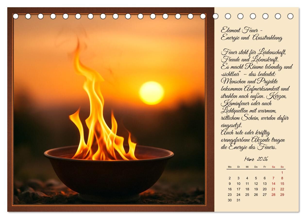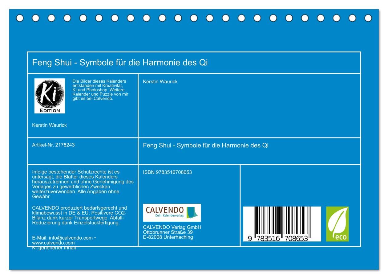 Dieser Kalender zeigt zwölf der wichtigsten Symbole des Feng Shui jedes Bild ein eigenständiges Kraftzeichen für Harmonie, Gesundheit und Wohlstand. Zu jedem Motiv gibt es eine kurze Erklärung, wie es das Qi im Raum stärkt und wo es im Bagua seinen Platz finde...