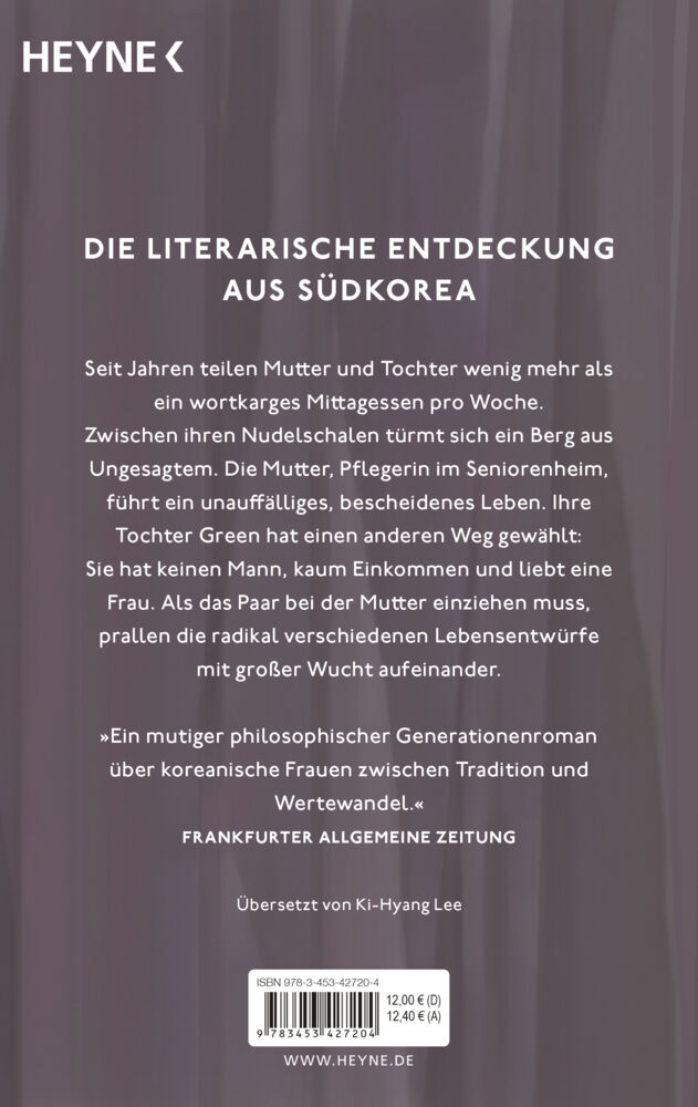 Die literarische Neuentdeckung aus Südkorea Seit Jahren teilen Mutter und Tochter wenig mehr als ein wortkarges Mittagessen pro Woche. Zwischen ihren Nudelschalen türmt sich ein Berg aus Ungesagtem. Die Mutter, Pflegerin im Seniorenheim, führt ein unauffällige...
