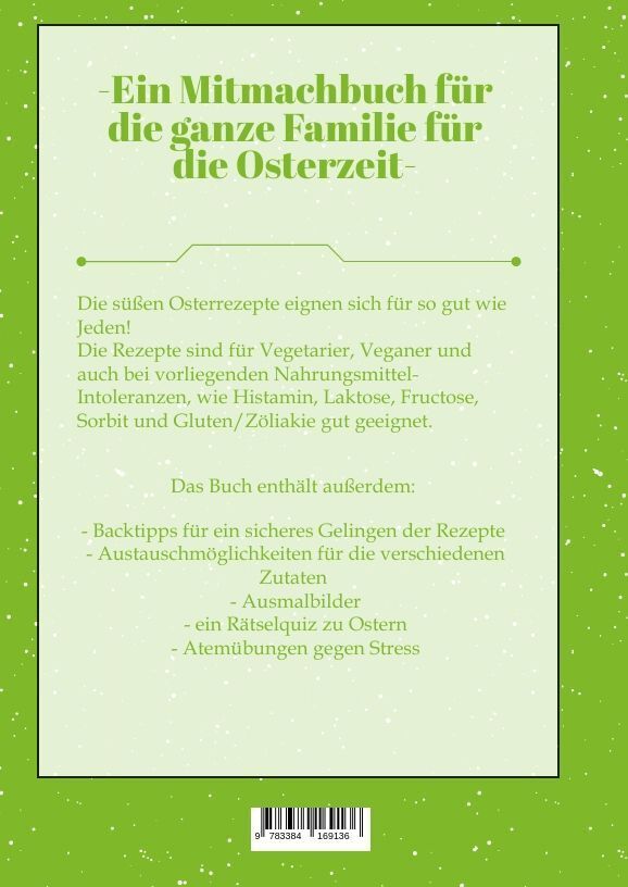 -Ein Mitmachbuch für die ganze Familie für die Osterzeit- Die süßen Osterrezepte eignen sich für so gut wie Jeden! Die Rezepte sind für Vegetarier, Veganer und auch bei vorliegenden Nahrungsmittel-Intoleranzen, wie Histamin, Laktose, Fructose, Sorbit und Glute...