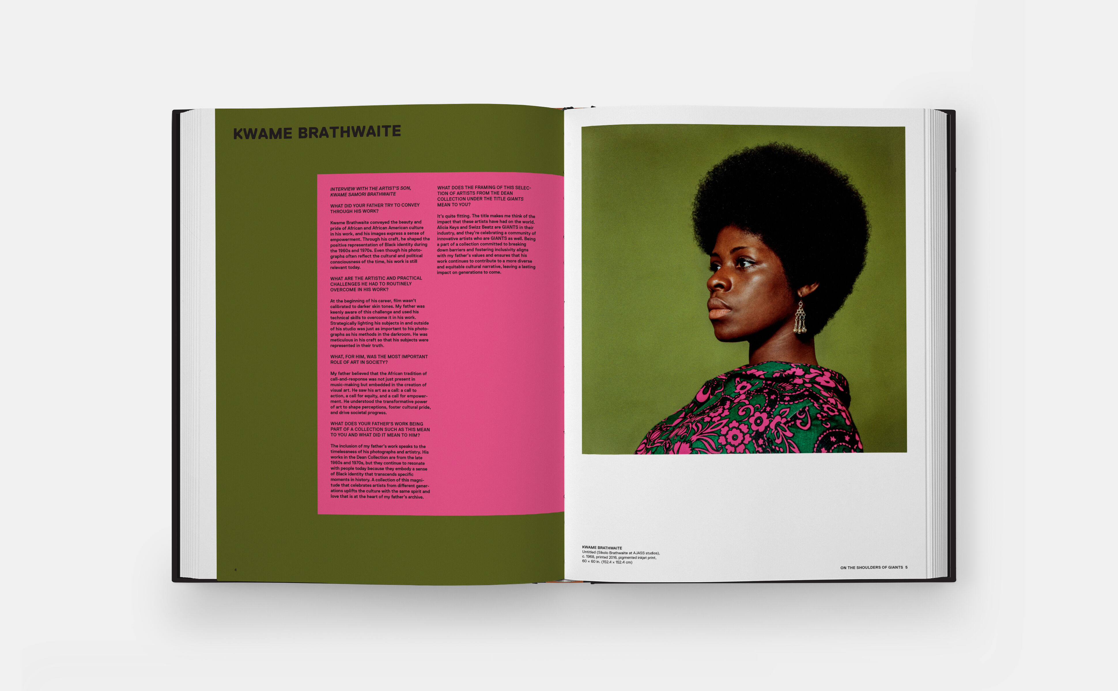 The book also features an exclusive conversation between curator Kimberli Gant and Swizz Beatz and Alicia Keys, as well as interviews with ten legendary artists: Derrick Adams; Kwame Brathwaite's son, Kwame Samori Brathwaite; Jordan Casteel; Nick Cave; Titus Kaphar; Ebony G. Patterson; Jamel Shabazz; Amy Sherald; Mickalene Thomas; and Kehinde Wiley.
