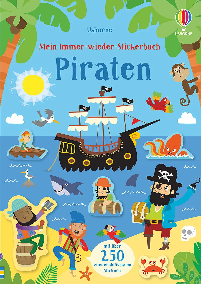 Bist du bereit für ein Abenteuer? Gehe mit den Piraten auf Schatzsuche, segle durch brausende Stürme oder hilf dem Smutje in der Kombüse mit über 250 wiederablösbaren Stickern kannst du die Szenen gestalten!