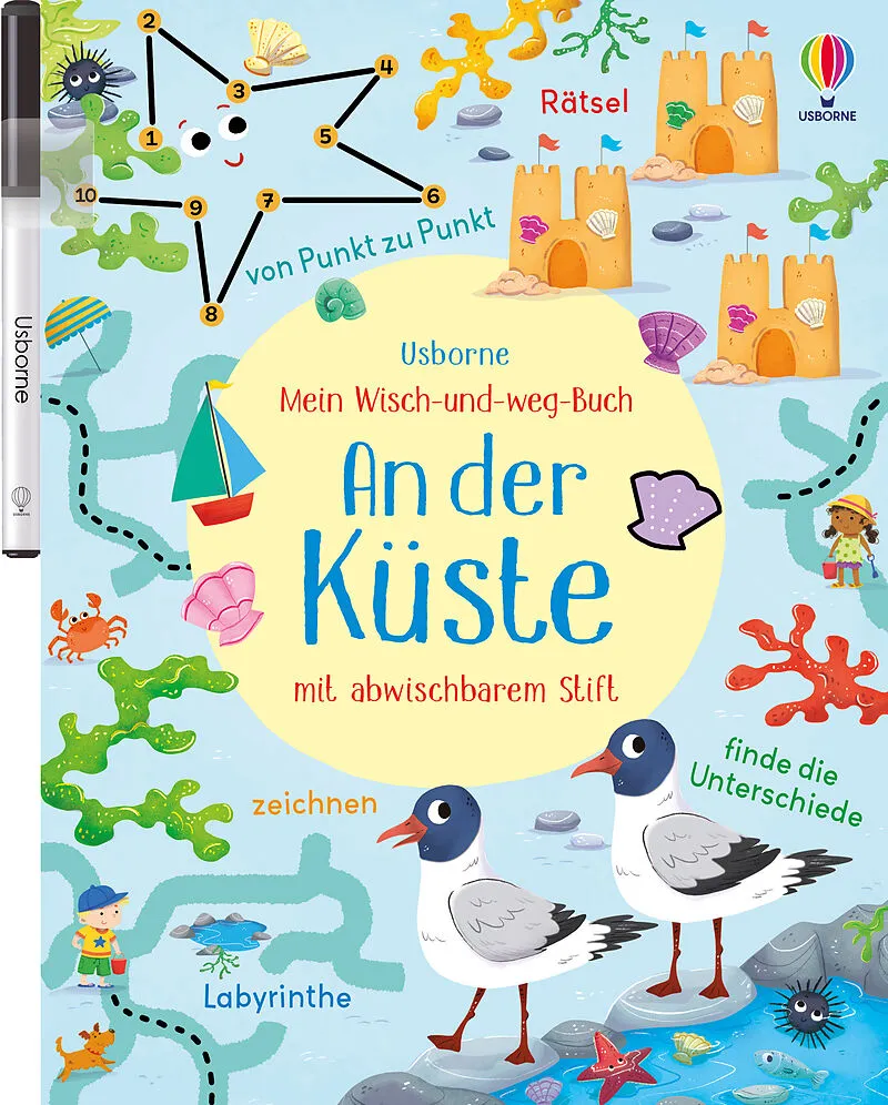 Heute fahren wir an die Küste! Suche den Weg zum Gezeitentümpel, finde die Unterschiede zwischen den Booten und male Bilder am Strand. Viele Zähl-, Zuordnungs- und Schwungübungen sorgen für jede Menge Spaß. Und falls doch mal was danebengeht: einfach wegwisch...