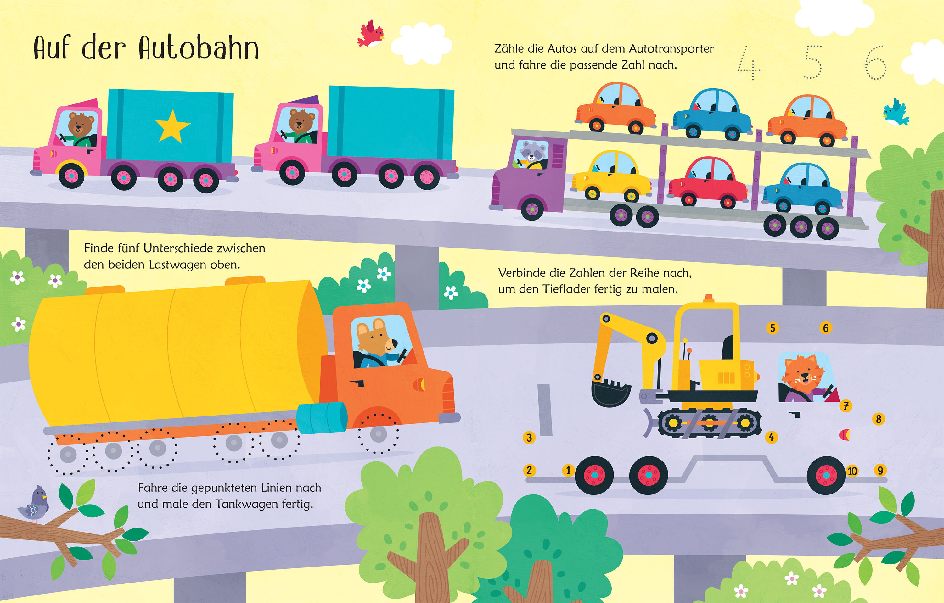 Spielerisch den Umgang mit dem Stift üben Überall sind Lastwagen und Bagger unterwegs! Du kannst ihnen auf den Straßen, auf der Baustelle, auf dem Flughafen oder im Lagerhaus bei der Arbeit zuschauen. Die vielen Zähl-, Zuordnungs- und Schwungübungen sorgen für...