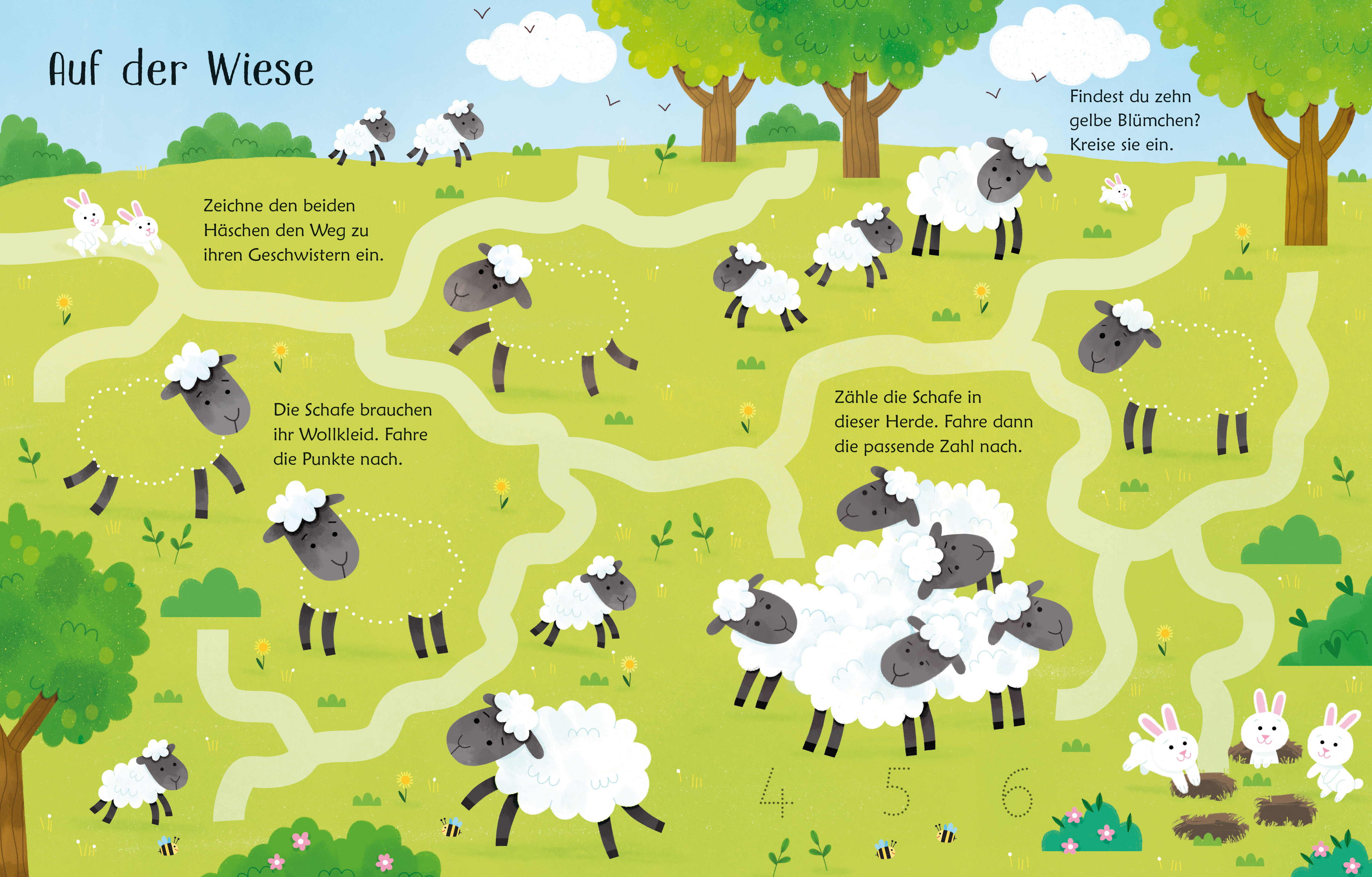 Zähle die Häschen auf der Wiese, finde die Unterschiede beim Osterpicknick und sei bei der Ostereiersuche im Garten dabei. Viele Zähl-, Zuordnungs- und Schwungübungen sorgen für jede Menge Spaß. Und falls doch mal was danebengeht: einfach wegwischen und noch ...