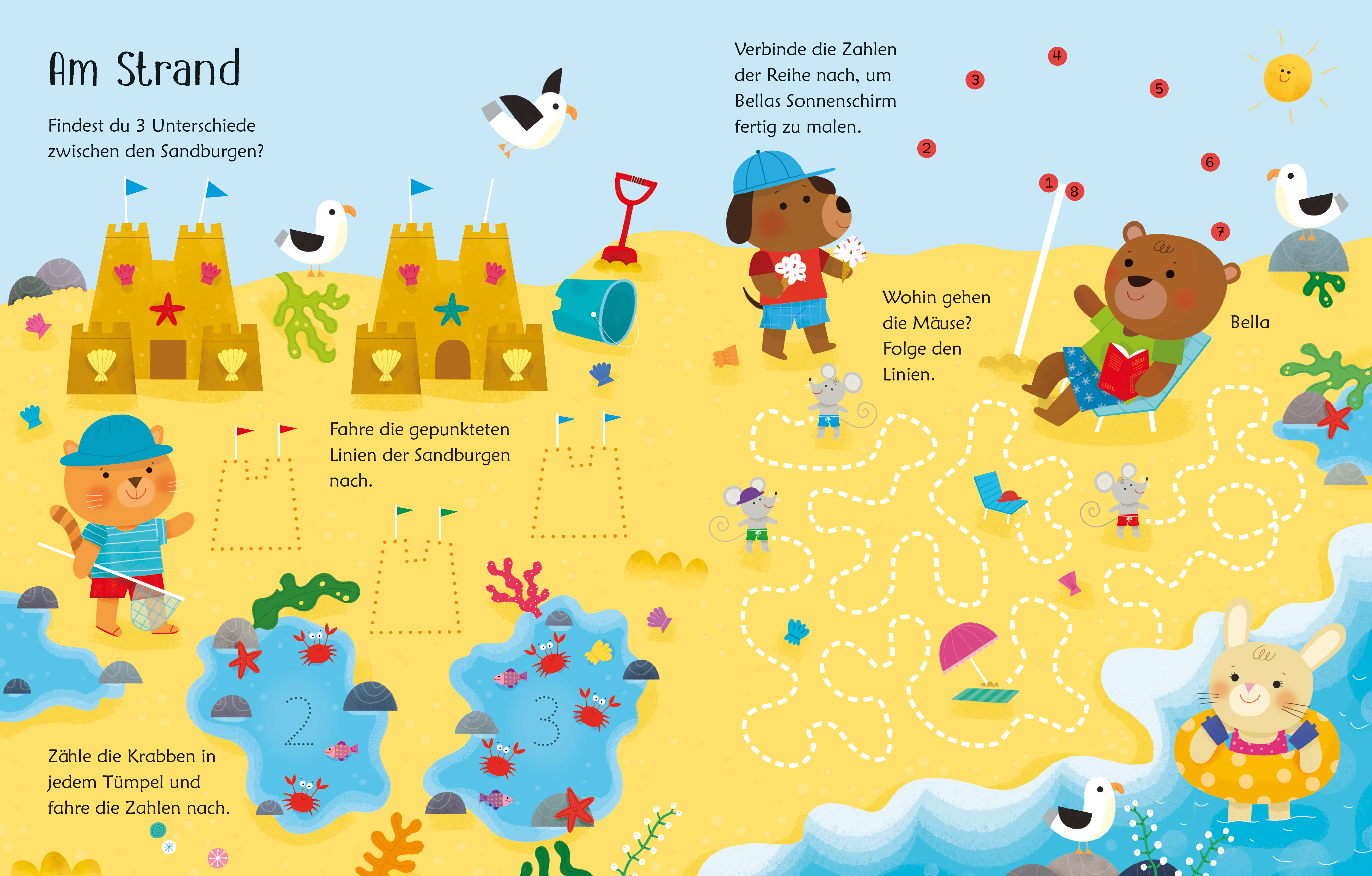 Viele Zähl-, Zuordnungs- und Schwungübungen sorgen für jede Menge tierischen Urlaubs-Spaß. Die Tiere machen Urlaub! Zeige dem Koala den Weg ans Meer und finde die Mäuse im Schwimmbad. Viele Zähl-, Zuordnungs- und Schwungübungen sorgen für jede Menge Spaß. Und...