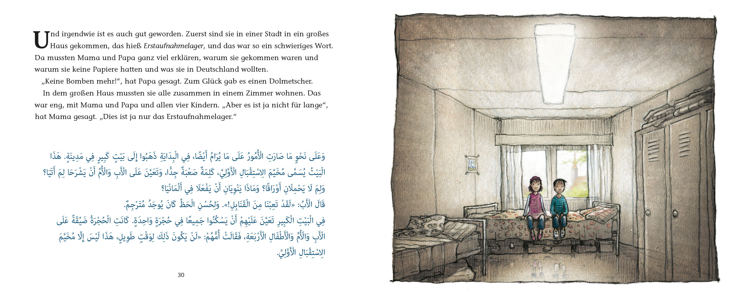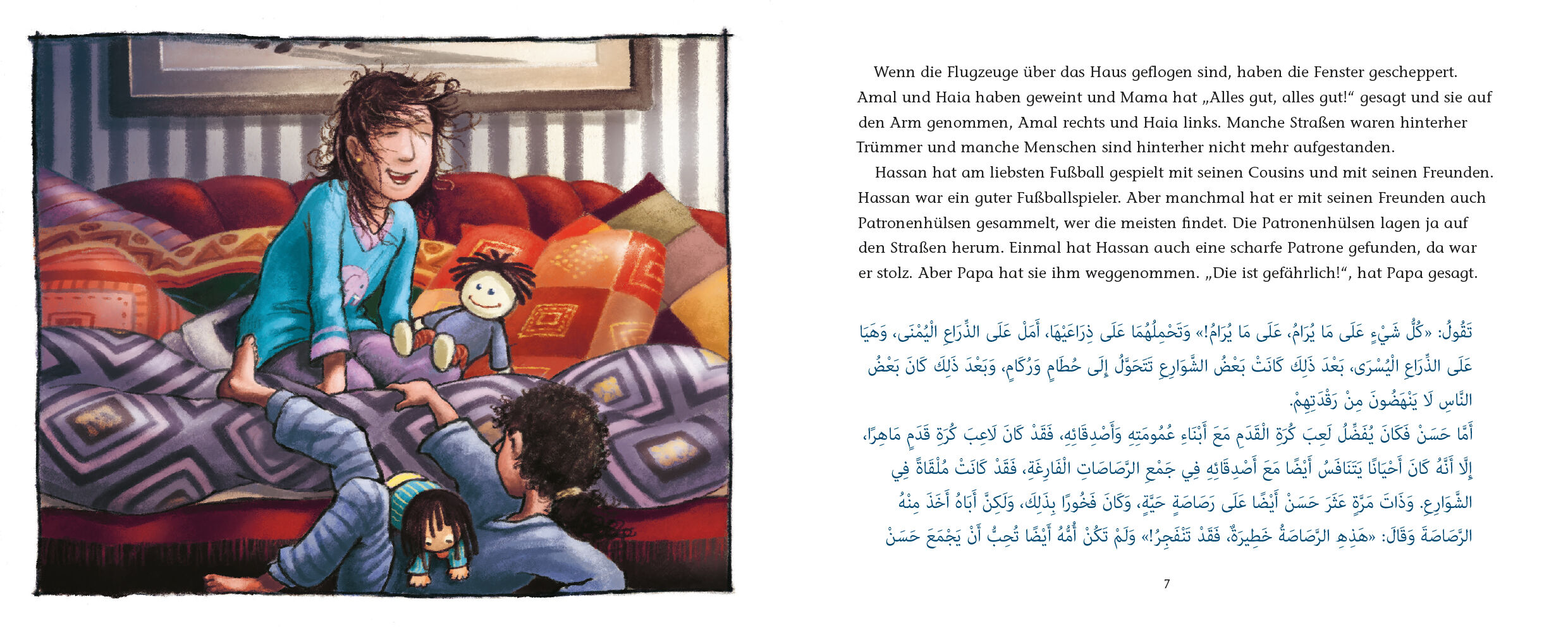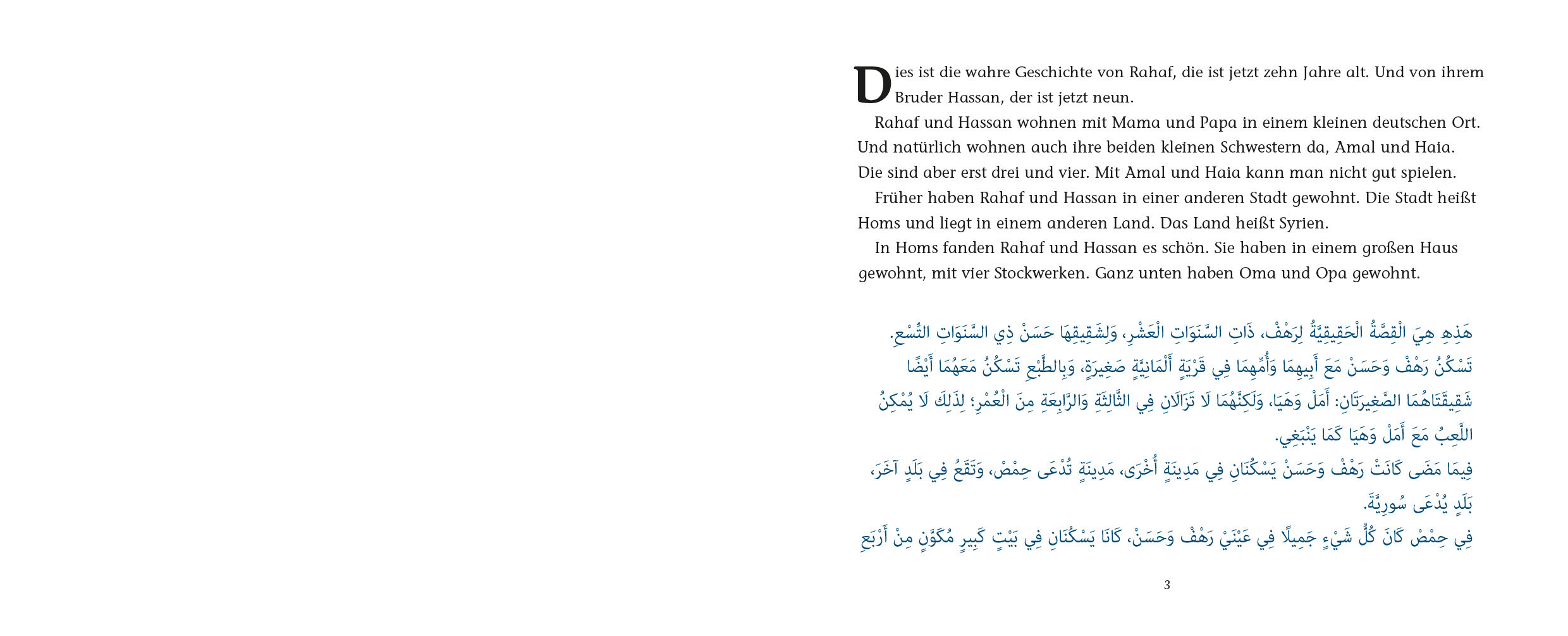 Dies ist die wahre Geschichte von Rahaf, die ist jetzt zehn Jahre alt. Und von ihrem Bruder Hassan, der ist jetzt neun. Früher haben Rahaf und Hassan in einer anderen Stadt gewohnt. Die Stadt heißt Homs und liegt in einem anderen Land. Das Land heißt Syrien. ...