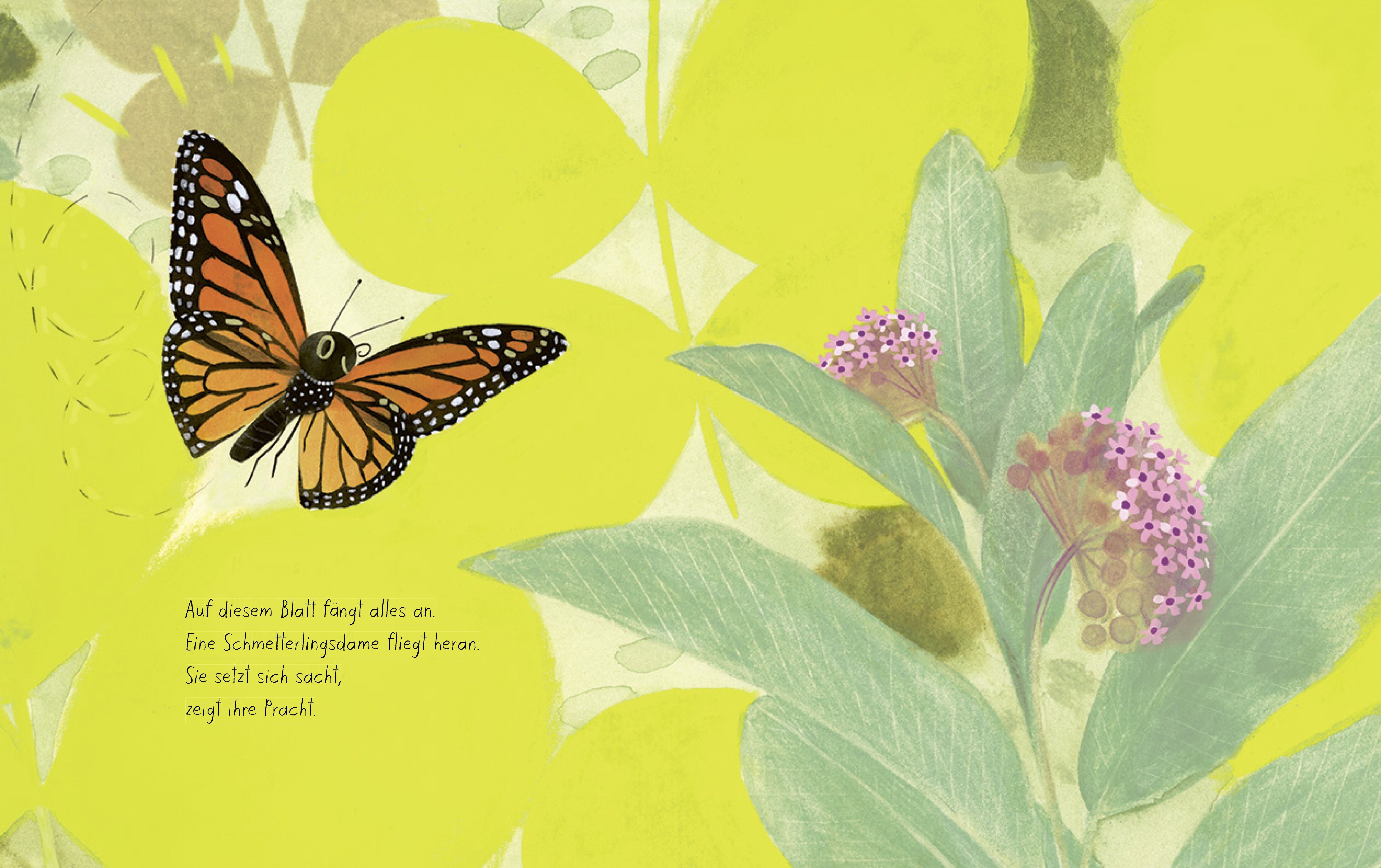 Bilderbuch über den Lebenszyklus eines Schmetterlings Mit frischer Sonderfarbe! Auf diesem Blatt fängt alles an. Ein Schmetterling setzt sich sacht, zeigt seine ganze Pracht. Mit dieser Leichtigkeit geht die Reise weiter. Ein Ei wird gelegt, eine Raupe schlüp...